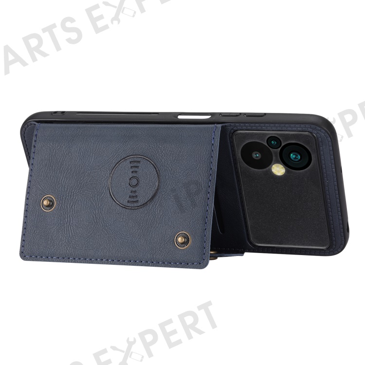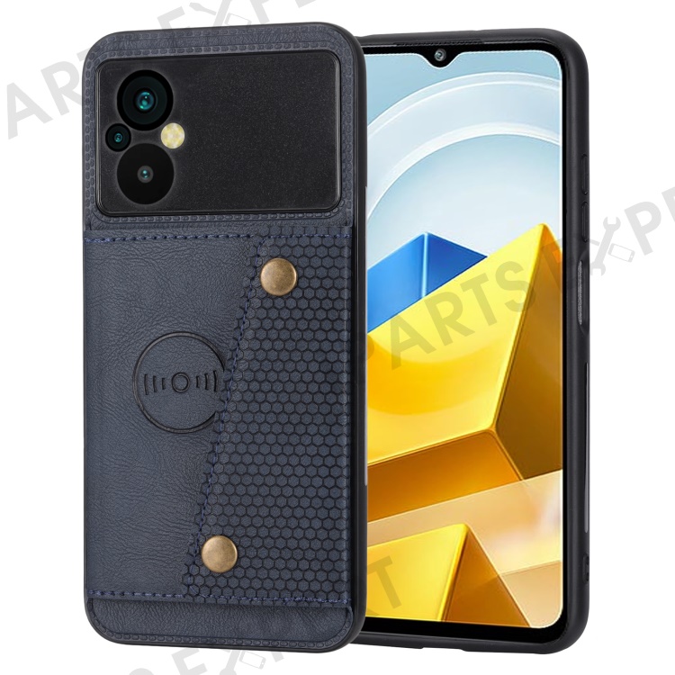 For Xiaomi Poco M5 4G Dual Button Card Slots Phone Case Magnetic Holder Built-in Metal Sheet Leather Coated TPU Kickstand Cover - Blue