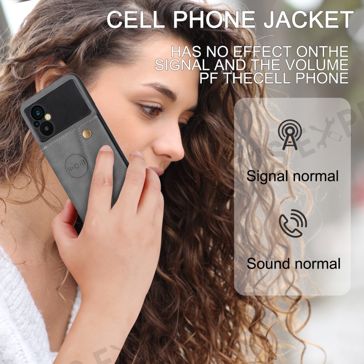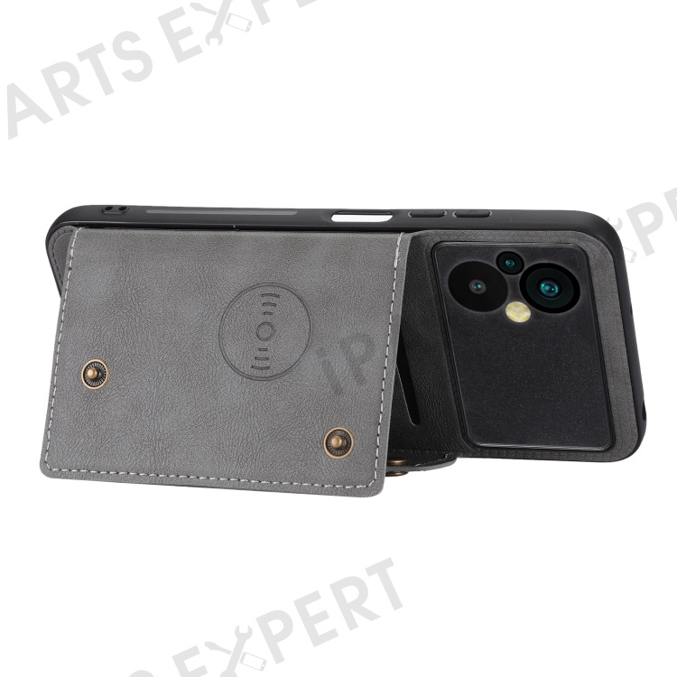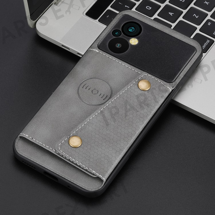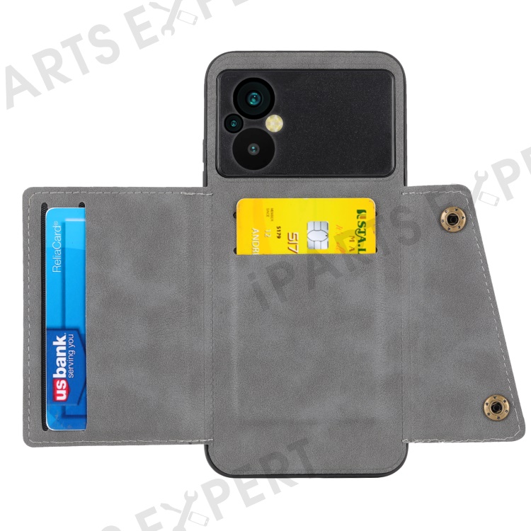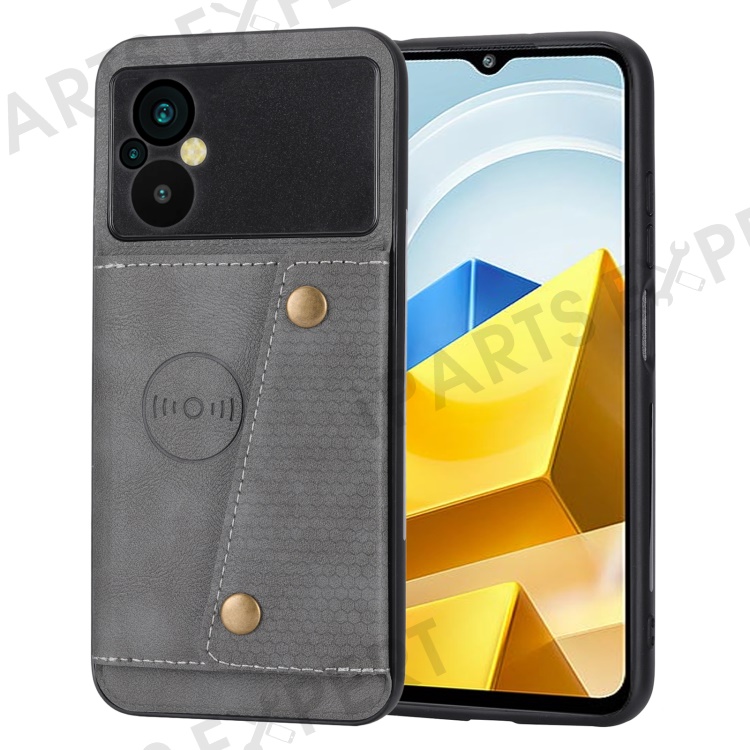 For Xiaomi Poco M5 4G Dual Button Card Slots Phone Case Magnetic Holder Built-in Metal Sheet Leather Coated TPU Kickstand Cover - Grey