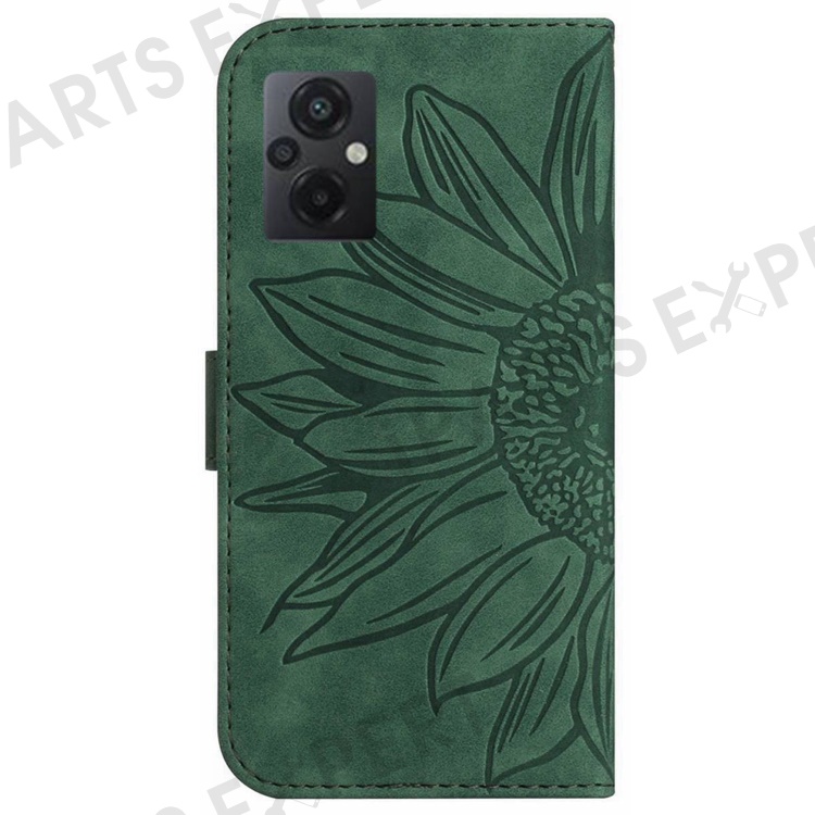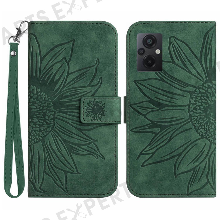For Xiaomi Poco M5 4G / M5 5G / M4 5G HT04 Imprinted Sunflower Wallet Case Skin-Touch PU Leather Stand Phone Case with Hand Strap - Dark Green