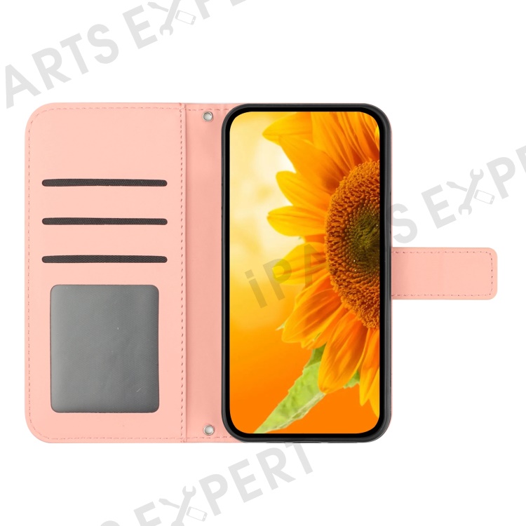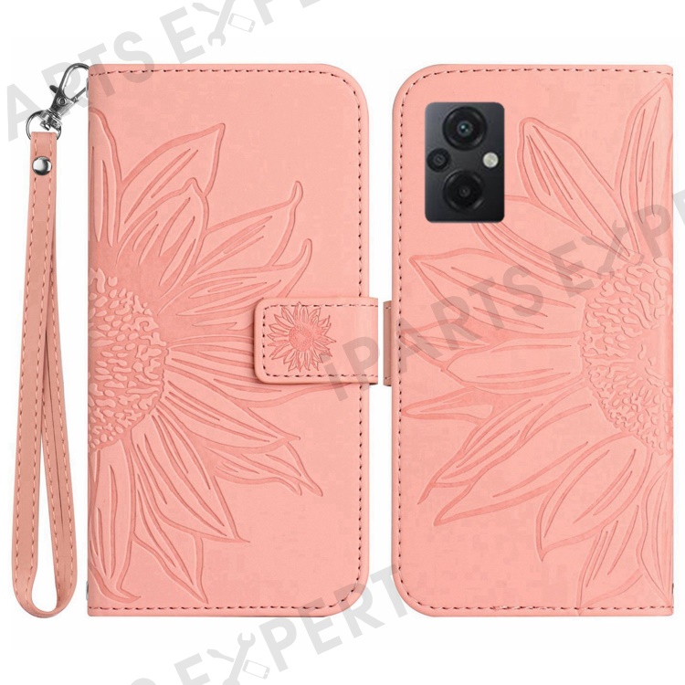 For Xiaomi Poco M5 4G / M5 5G / M4 5G HT04 Imprinted Sunflower Wallet Case Skin-Touch PU Leather Stand Phone Case with Hand Strap - Light Pink