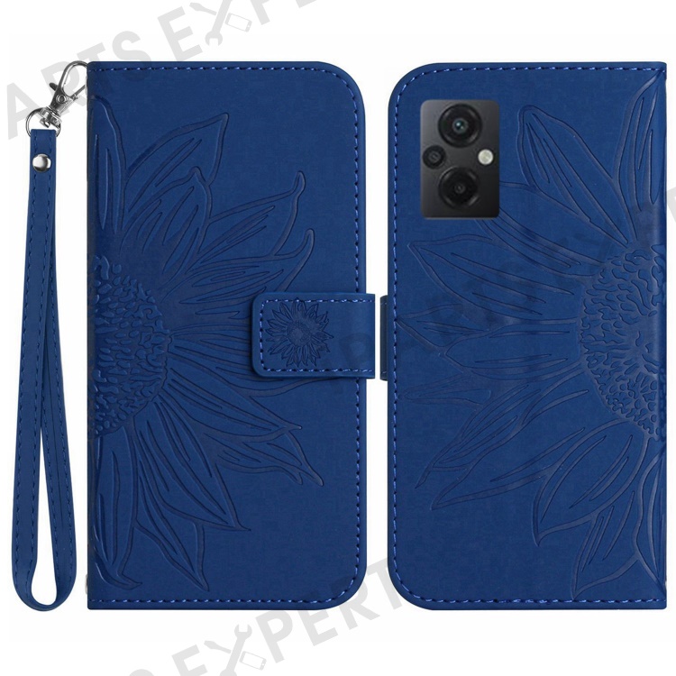 For Xiaomi Poco M5 4G / M5 5G / M4 5G HT04 Imprinted Sunflower Wallet Case Skin-Touch PU Leather Stand Phone Case with Hand Strap - Sapphire