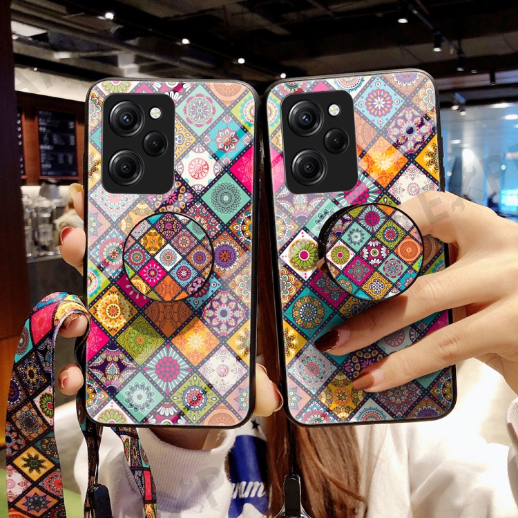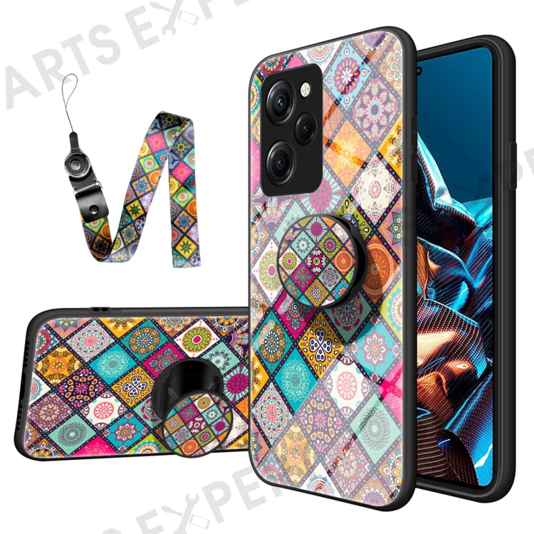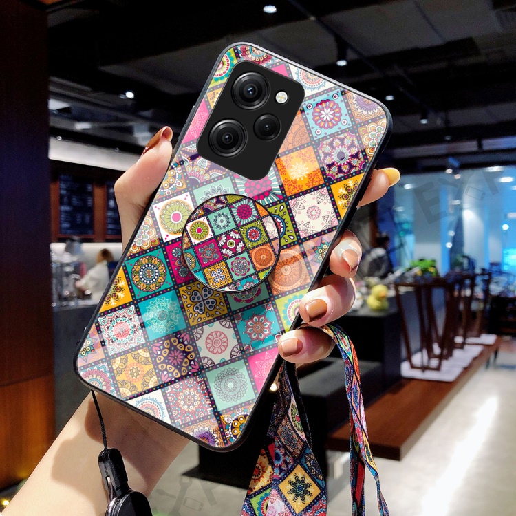For Xiaomi Poco X5 Pro 5G / Redmi Note 12 Pro Speed 5G Kickstand Phone Case Flower Pattern PC+TPU+Tempered Glass Cover with Lanyard - Checkered Pattern