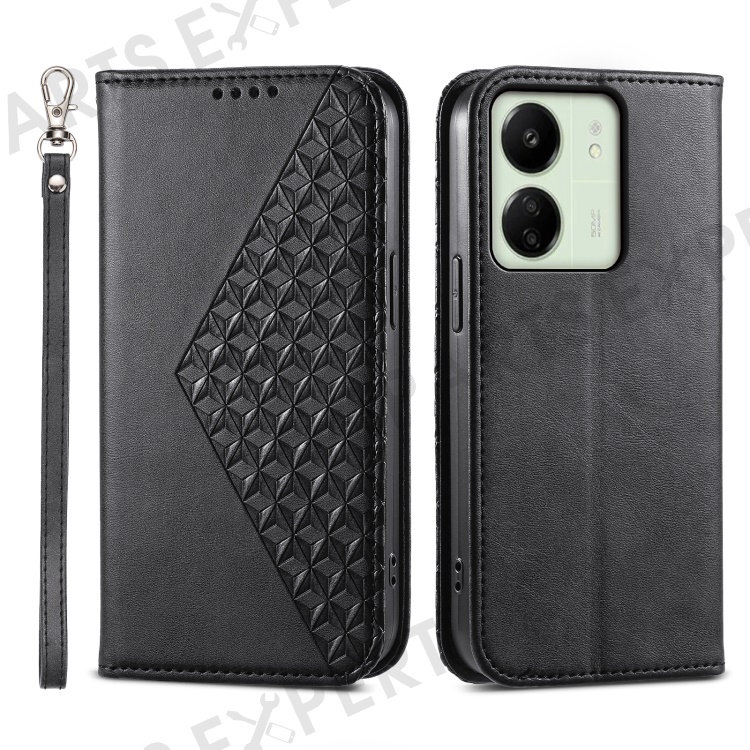 For Xiaomi Redmi 13C 4G / 13C 5G / Poco C65 4G / Poco M6 5G / 13R 5G Case Imprinted Rhombus Pattern PU Leather Mobile Phone Cover - Black