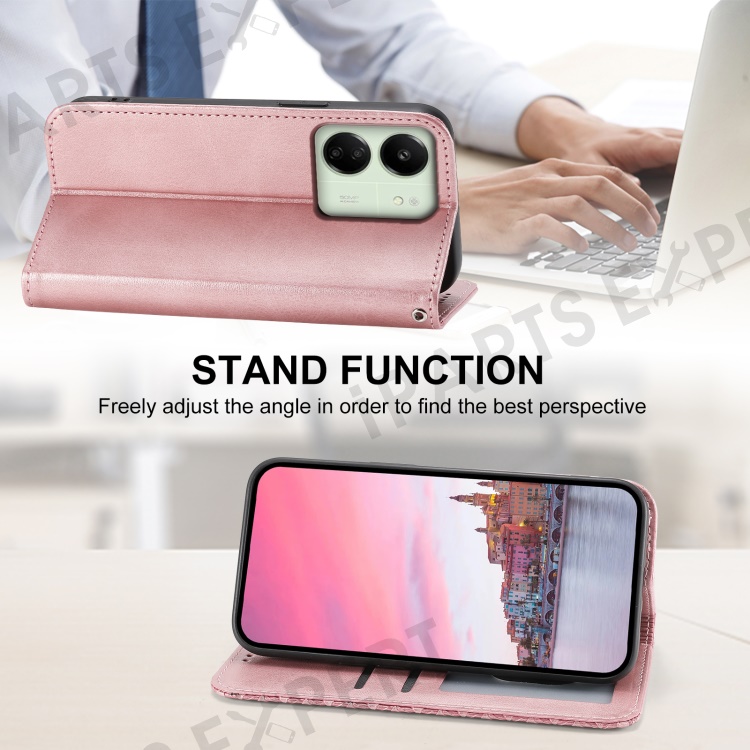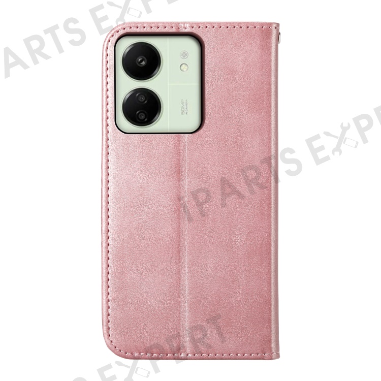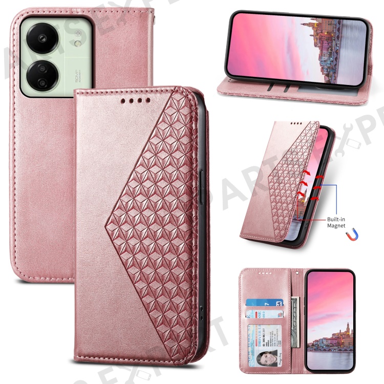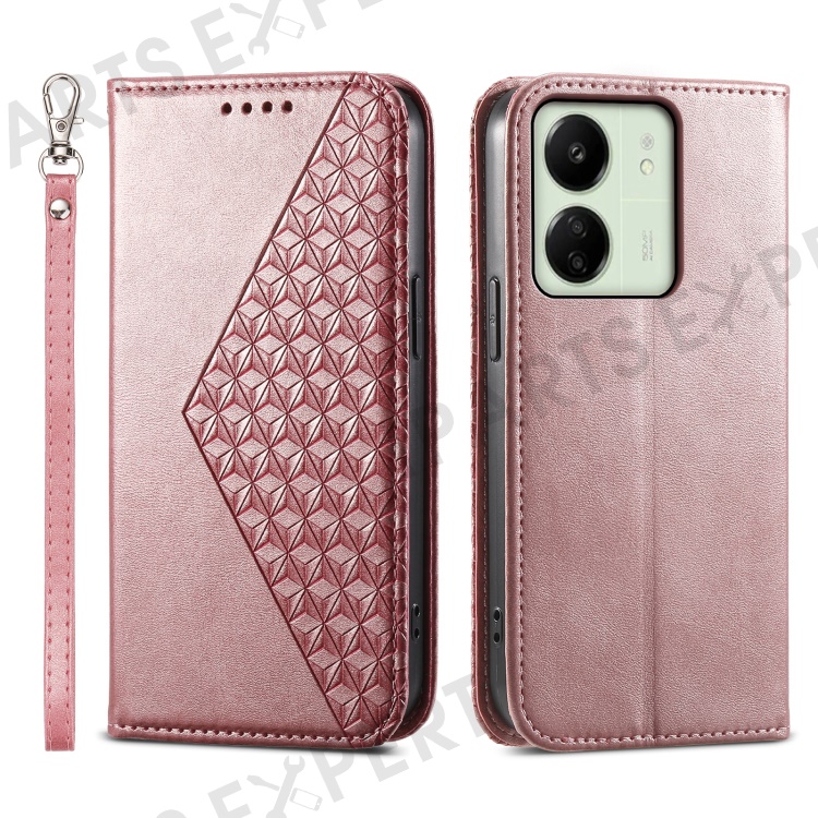 For Xiaomi Redmi 13C 4G / 13C 5G / Poco C65 4G / Poco M6 5G / 13R 5G Case Imprinted Rhombus Pattern PU Leather Mobile Phone Cover - Rose Gold