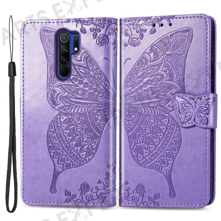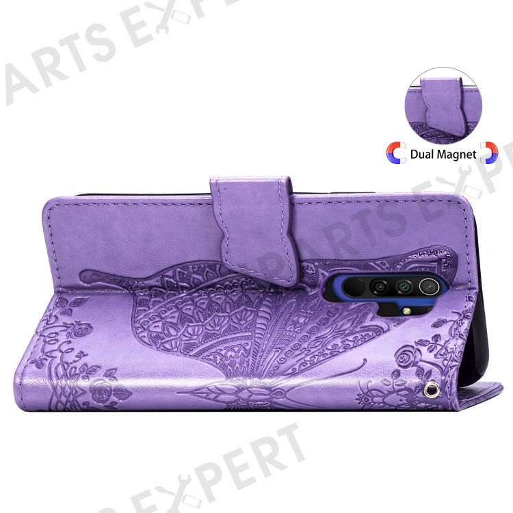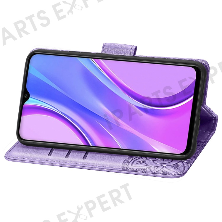 For Xiaomi Redmi 9 Anti-Scratch PU Leather Magnetic Closure Phone Wallet Cover Imprinted Butterfly Pattern Stand Case - Light Purple