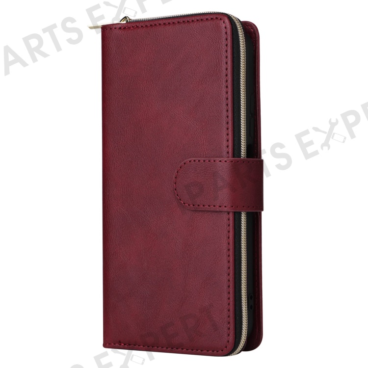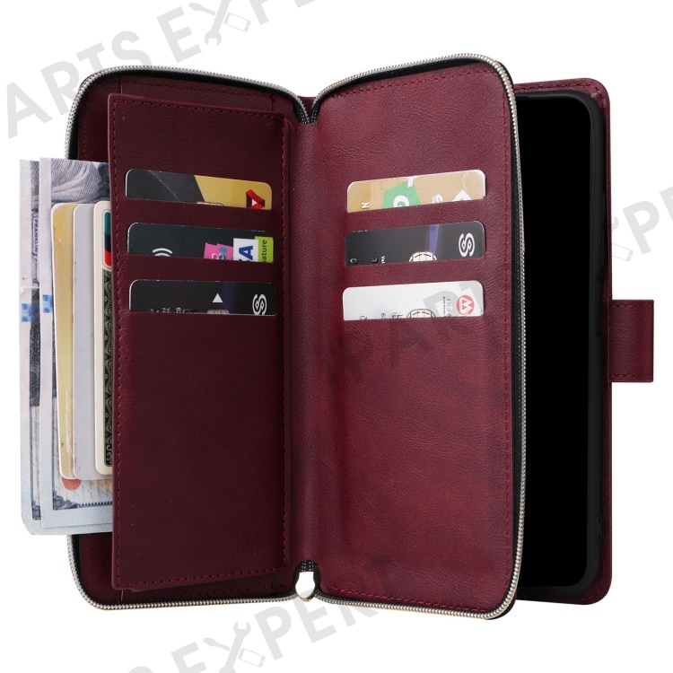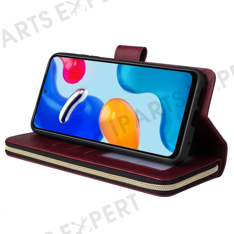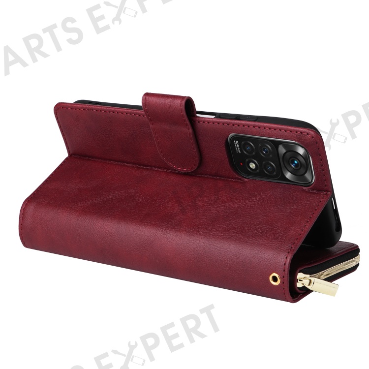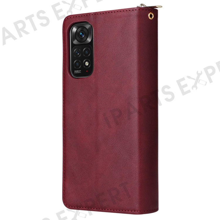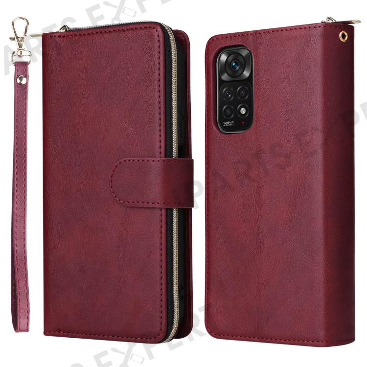 For Xiaomi Redmi Note 12 Pro 4G / 11 Pro 4G (MediaTek) / Note 11 Pro 5G (Qualcomm) / Note 11E Pro 5G PU Leather Zipper Pocket Case 9 Card Slots Flip Stand Cover with Strap - Wine Red