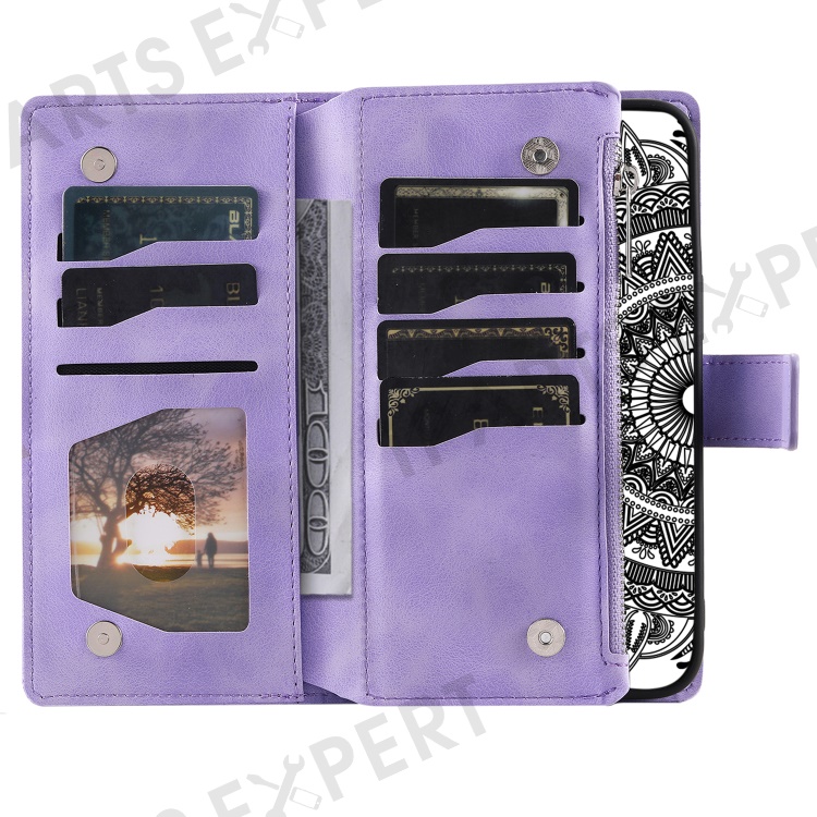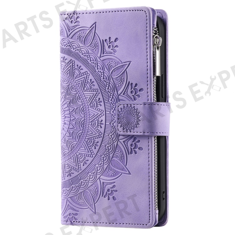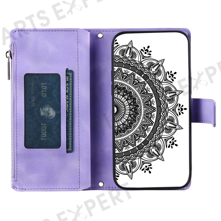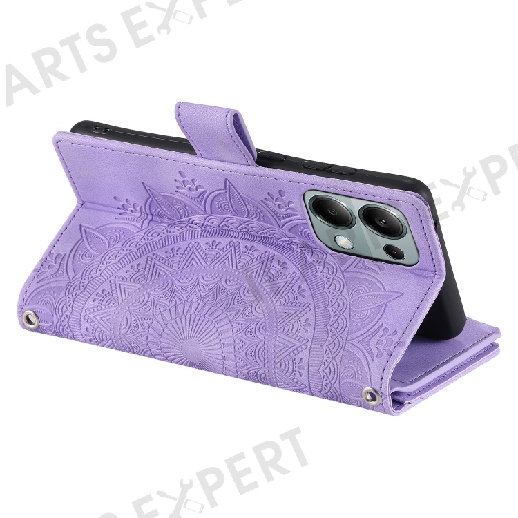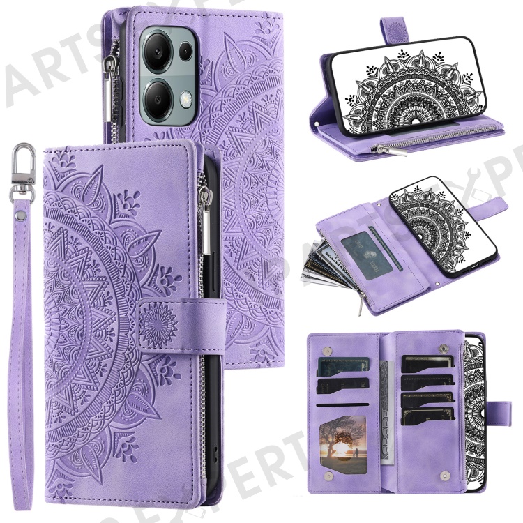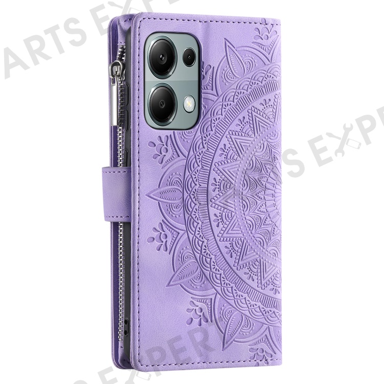 For Xiaomi Redmi Note 13 4G Case Mandala Imprinted Zipper Pocket Flip Leather Phone Cover with Strap - Purple