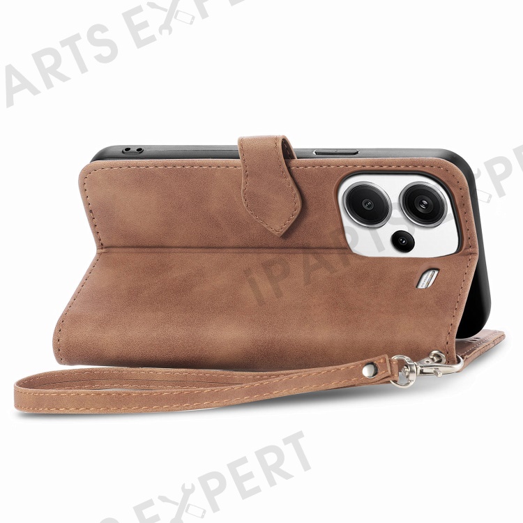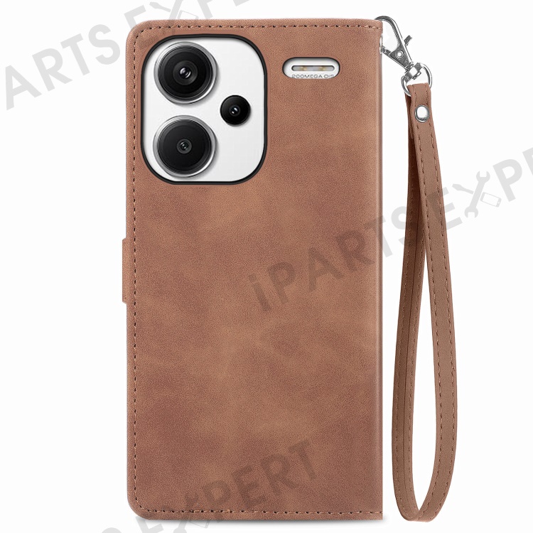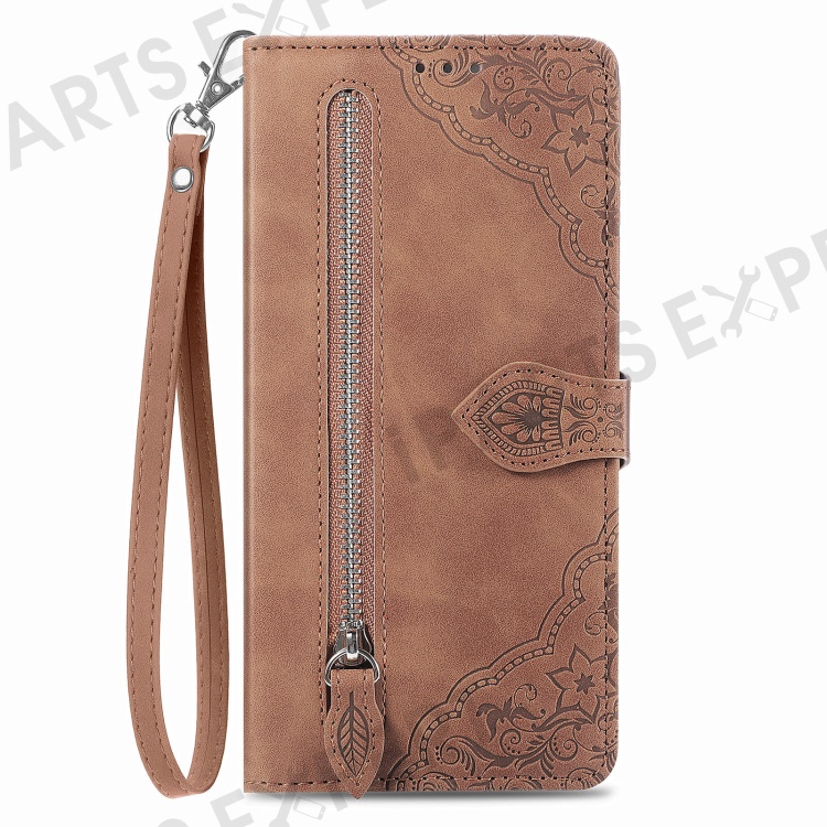 For Xiaomi Redmi Note 13 Pro+ 5G Zipper Wallet Case with Strap Flower Imprint PU Leather Phone Cover - Brown