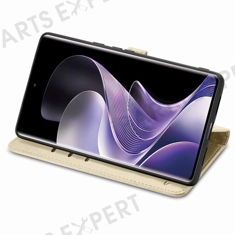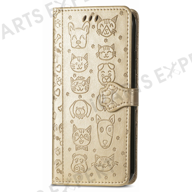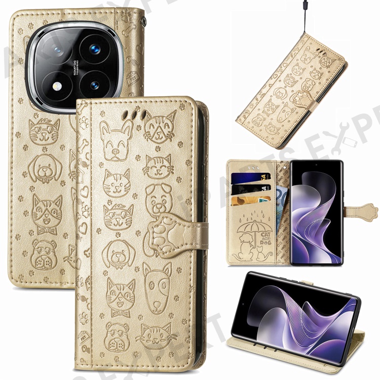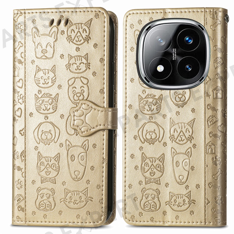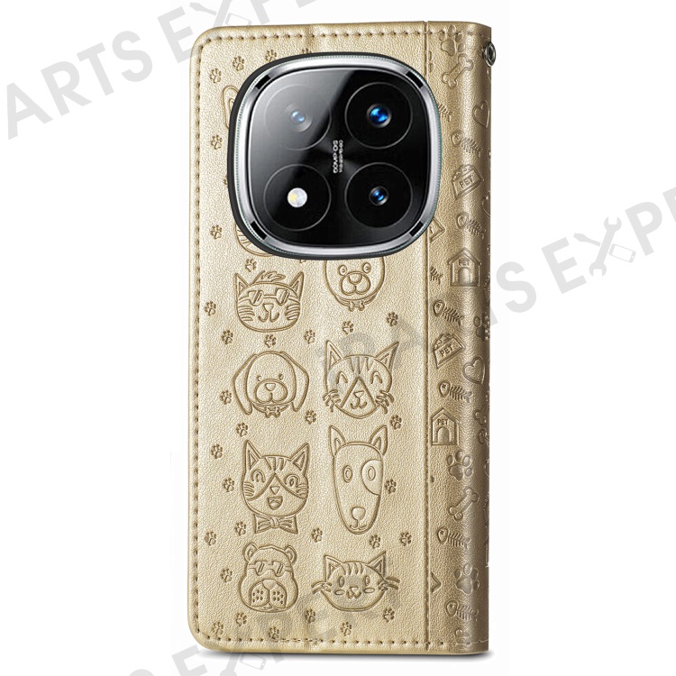 For Xiaomi Redmi Note 14 Pro 5G / Poco X7 5G Case Leather Wallet Flip Phone Cover Cute Cat Dog Pattern - Gold