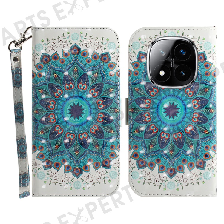 For Xiaomi Redmi Note 14 Pro 5G / Poco X7 5G Case Pattern Printing Leather Wallet Phone Cover with Wrist Strap - Peacock Wreath