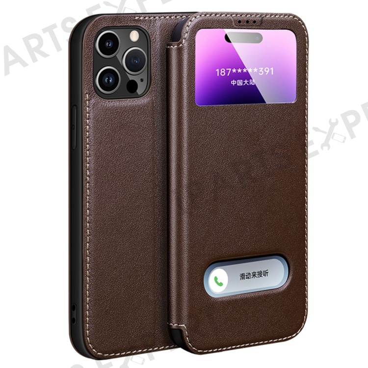 Genuine Cowhide Leather Case for iPhone 14 Pro Max Shockproof Cover Dual Window Anti-Drop Phone Case with Stand - Brown