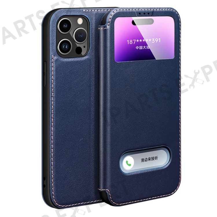 Genuine Cowhide Leather Case for iPhone 14 Pro Max Shockproof Cover Dual Window Anti-Drop Phone Case with Stand - Sapphire