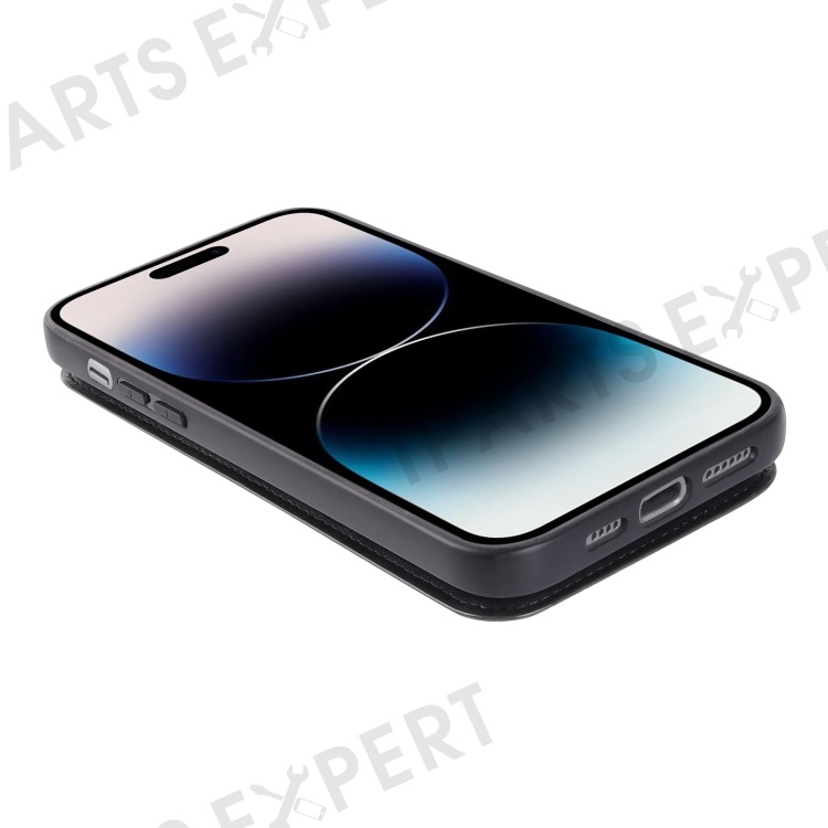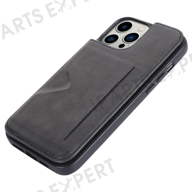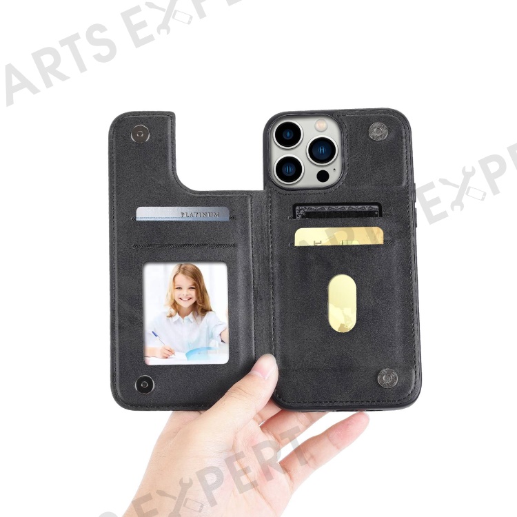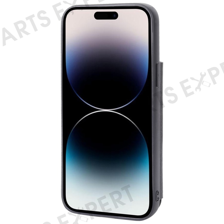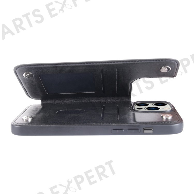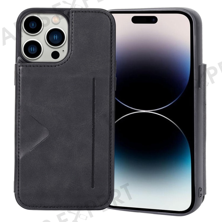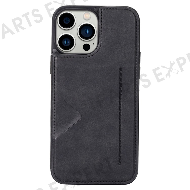 HANMAN Mika Series For iPhone 14 Pro Max Card Holder Magnetic Button Phone Case PU Leather Coated TPU Cover - Black