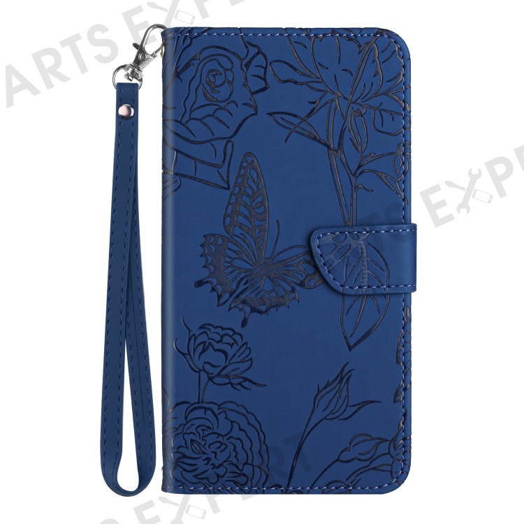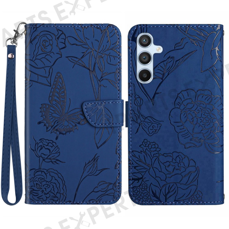 HT03 For Samsung Galaxy A25 5G (Global) (161.0 x 76.5 x 8.3mm) Leather Wallet Case Stand Imprinted Cover with Hand Strap - Blue