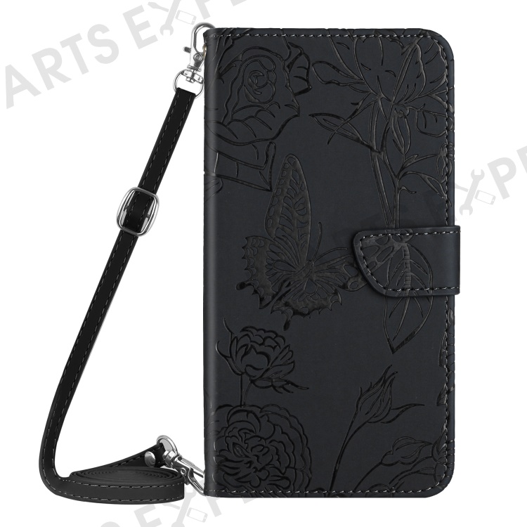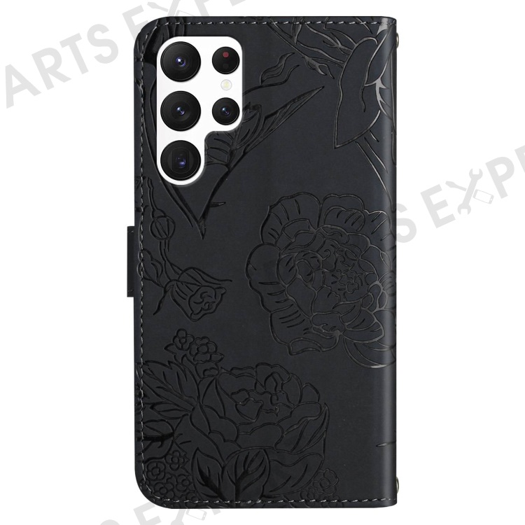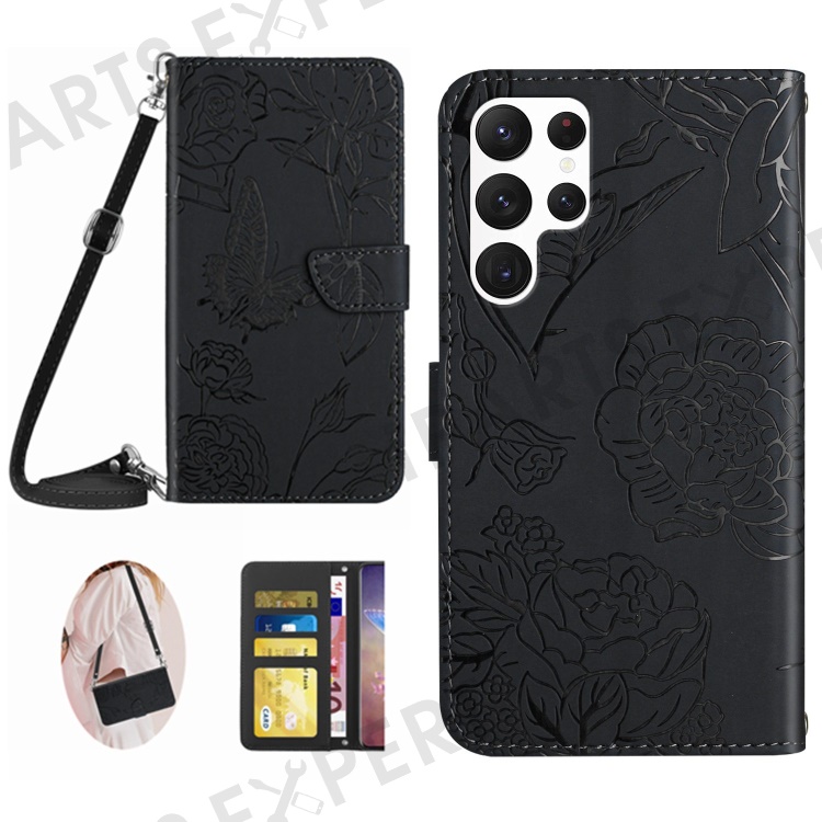 HT03 For Samsung Galaxy S24 Ultra Case Cell Phone Imprinted PU Leather Cover with Long Strap - Black