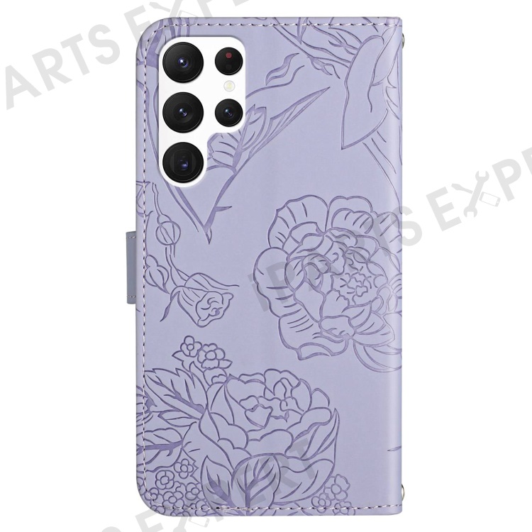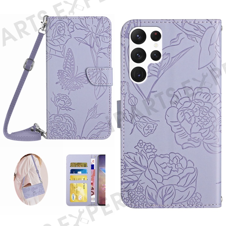 HT03 For Samsung Galaxy S24 Ultra Case Cell Phone Imprinted PU Leather Cover with Long Strap - Purple