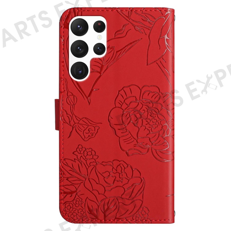 HT03 For Samsung Galaxy S24 Ultra Case Cell Phone Imprinted PU Leather Cover with Long Strap - Red