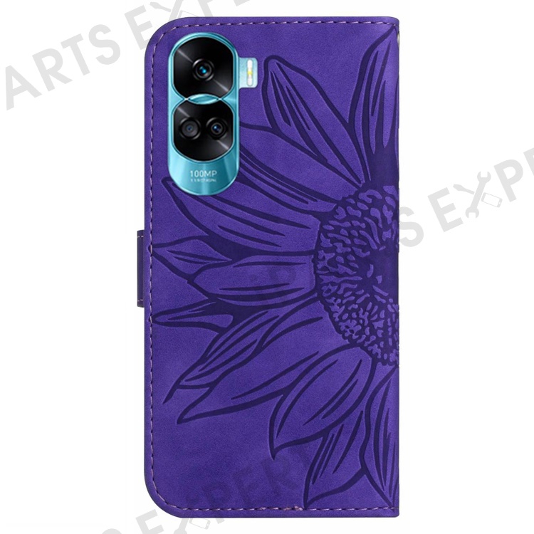 HT04 For Honor 90 Lite 5G / X50i 5G Stand Cover Sunflower Imprint PU Leather Wallet Phone Case with Shoulder Strap - Dark Purple