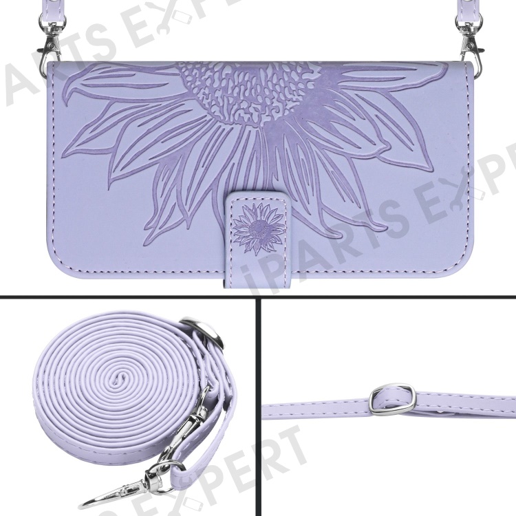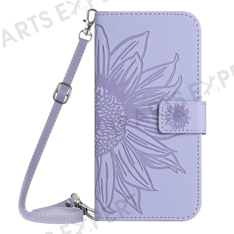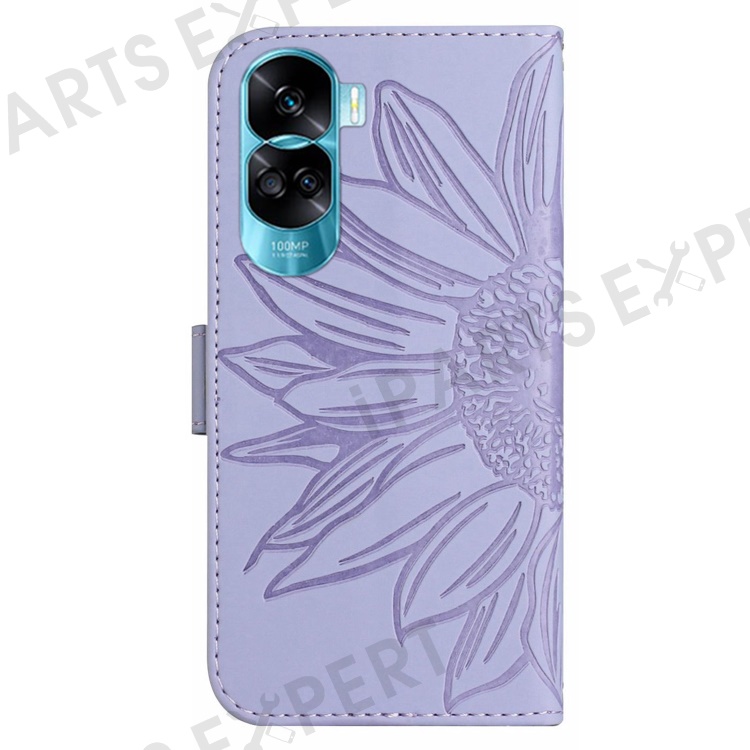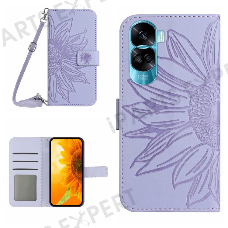 HT04 For Honor 90 Lite 5G / X50i 5G Stand Cover Sunflower Imprint PU Leather Wallet Phone Case with Shoulder Strap - Light Purple