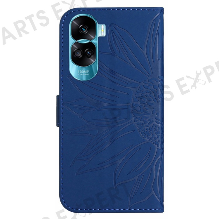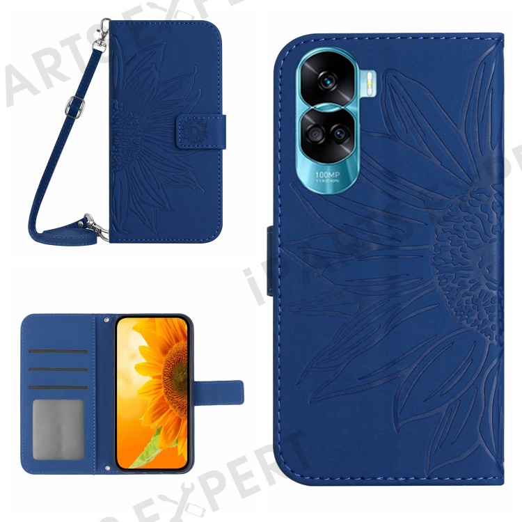 HT04 For Honor 90 Lite 5G / X50i 5G Stand Cover Sunflower Imprint PU Leather Wallet Phone Case with Shoulder Strap - Sapphire