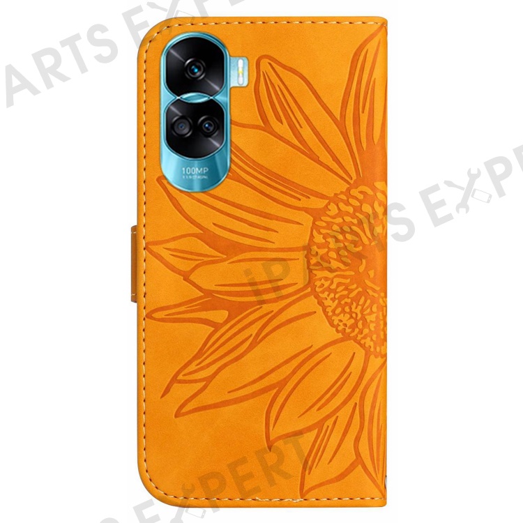 HT04 For Honor 90 Lite 5G / X50i 5G Stand Cover Sunflower Imprint PU Leather Wallet Phone Case with Shoulder Strap - Yellow