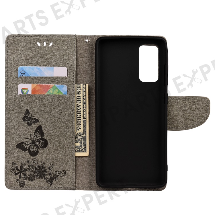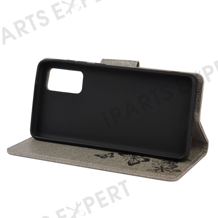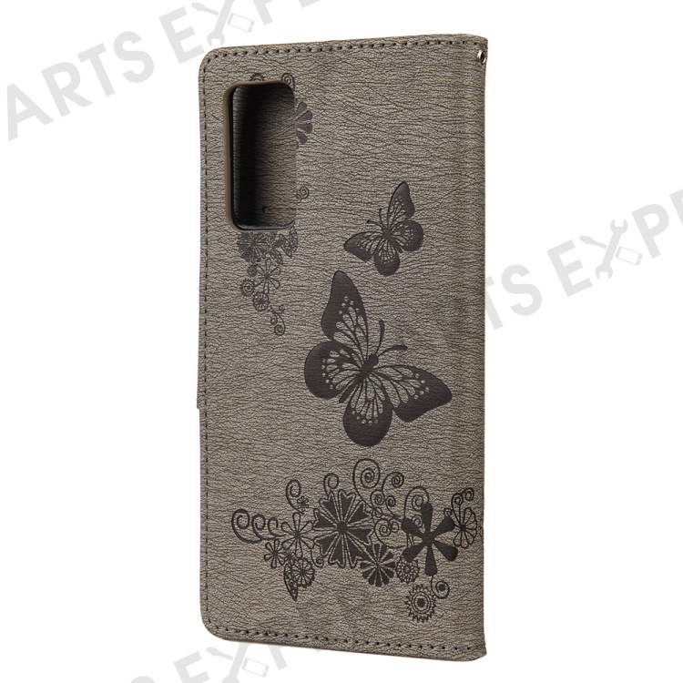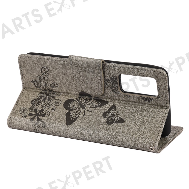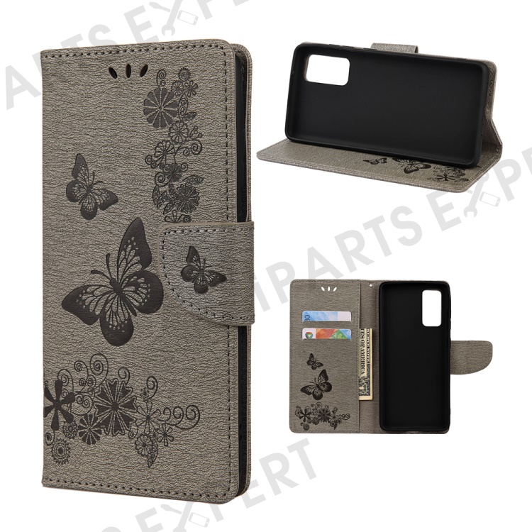 Imprint Butterflies Flower Wallet Stand Leather Case Smartphone Cover Shell for Samsung Galaxy A52 4G/5G / A52s 5G - Grey