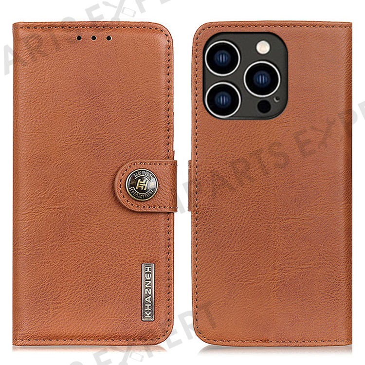 KHAZNEH For iPhone 15 Pro Max Cowhide Texture Flip Stand Phone Case Leather Wallet Shell - Brown