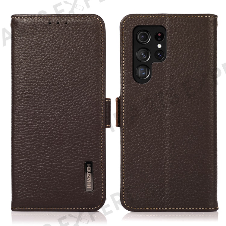 KHAZNEH For Samsung Galaxy S24 Ultra Phone Case Genuine Cow Leather Wallet Stand Cover - Brown