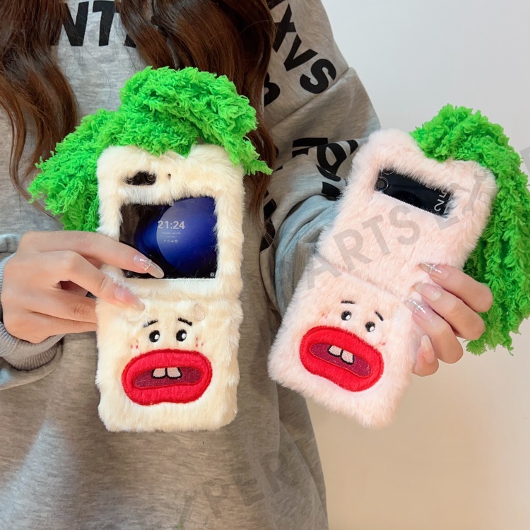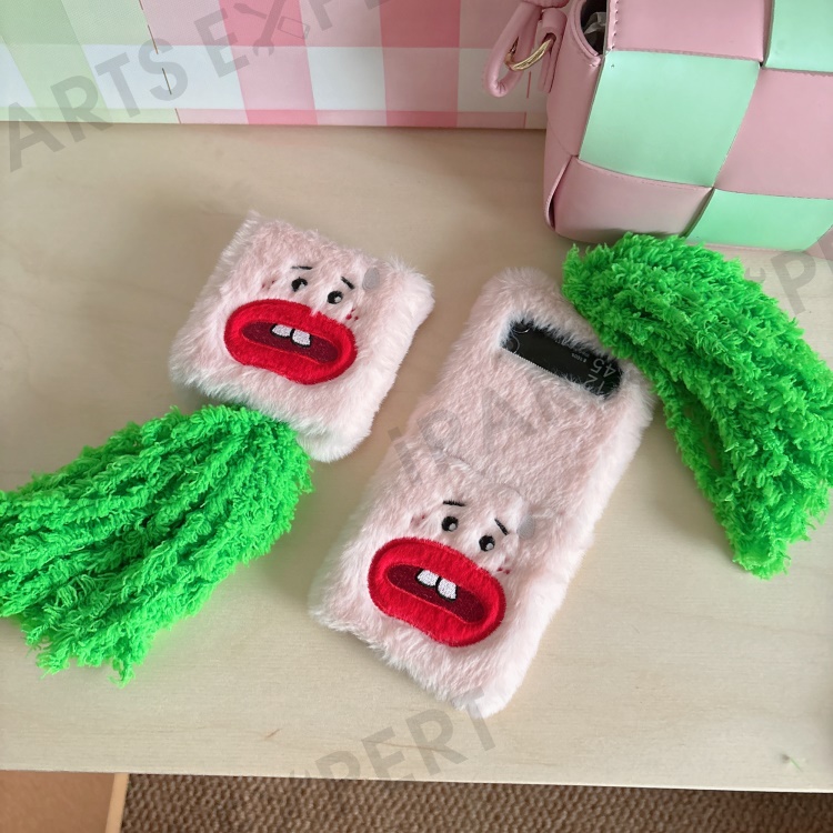 KJS-022 For Samsung Galaxy Z Flip7 FE 5G / Z Flip6 5G Case Bucktooth Green Hair Lens Kickstand Hard PC Warm Plush Phone Cover - Pink
