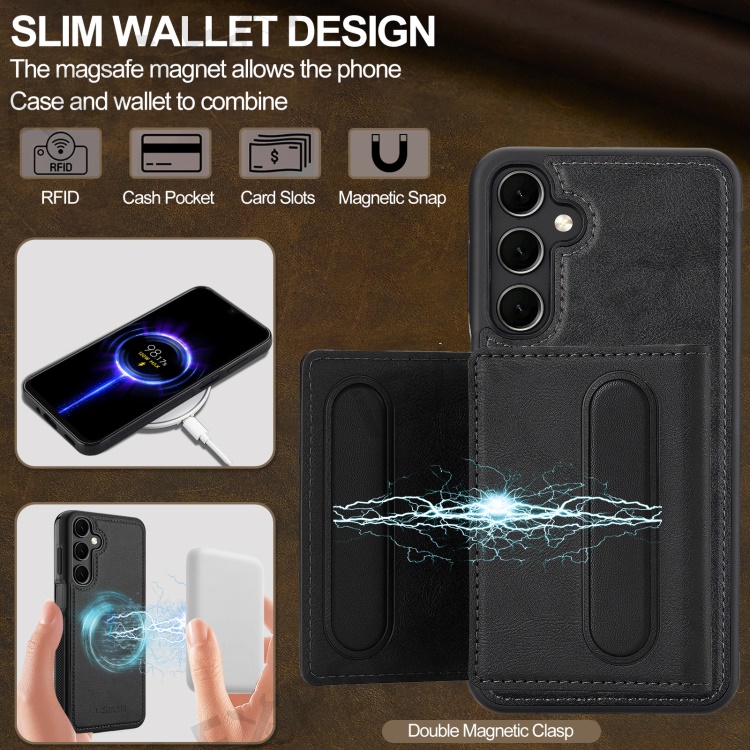 LC.IMEEKE L5 For Samsung Galaxy S24 FE Magnetic Phone Case Leather Back Cover with Detachable Card Holder - Black
