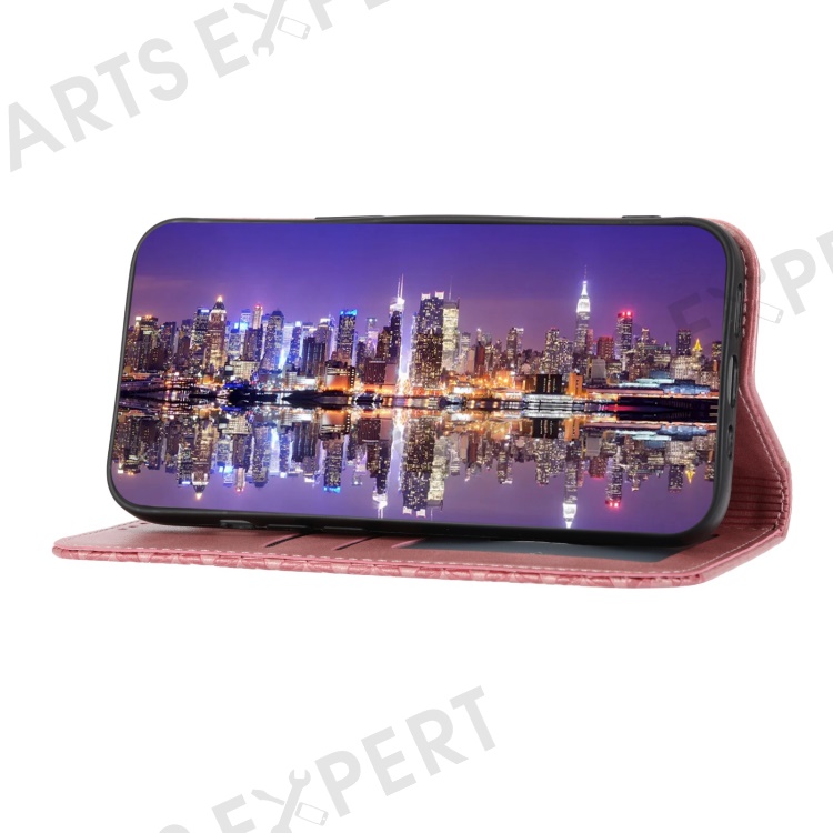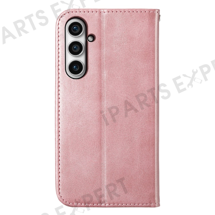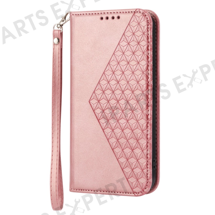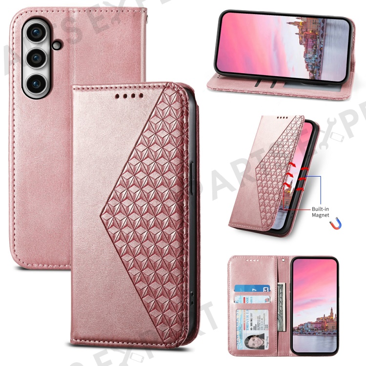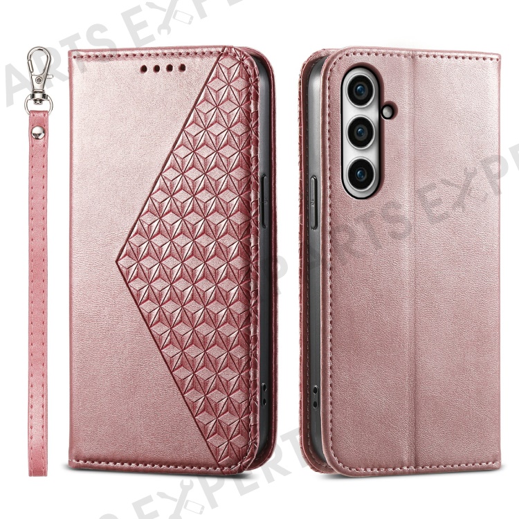 Leather Phone Case for Samsung Galaxy S23 FE Imprinted Rhombus Pattern Wallet Stand Cover - Rose Gold