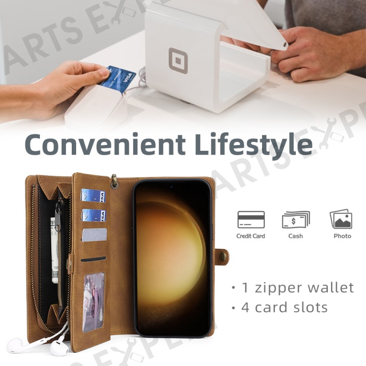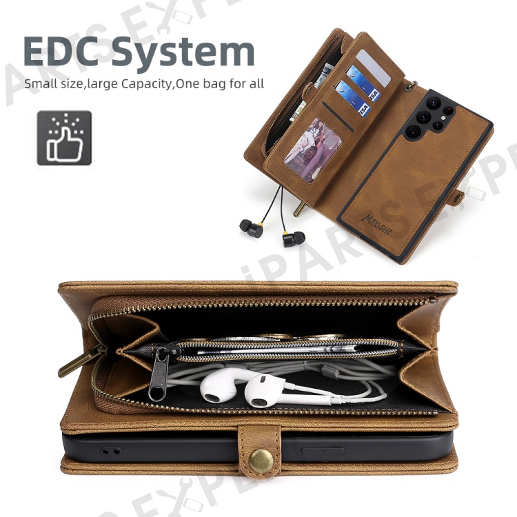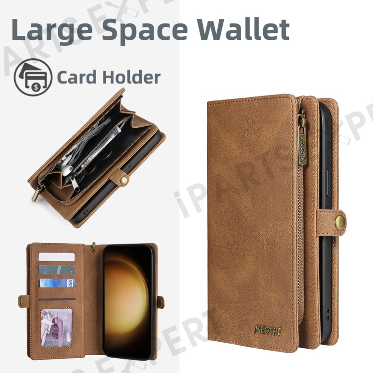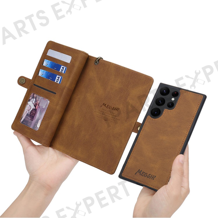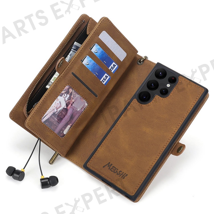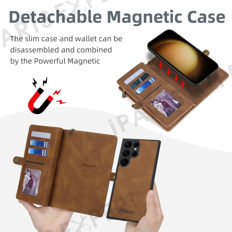 MEGSHI 017 Series Leather Case for Samsung Galaxy S23 Ultra Detachable Magnet Cover Zipper Wallet Shell with Wrist Strap - Brown