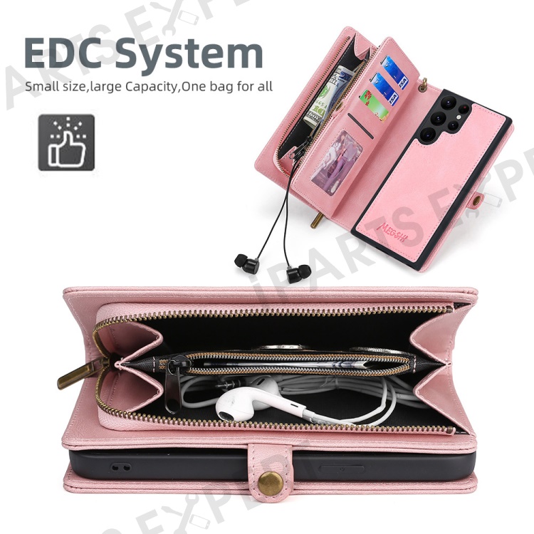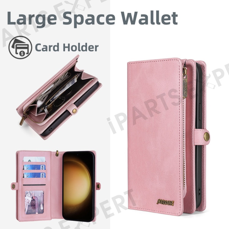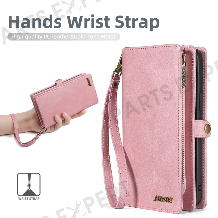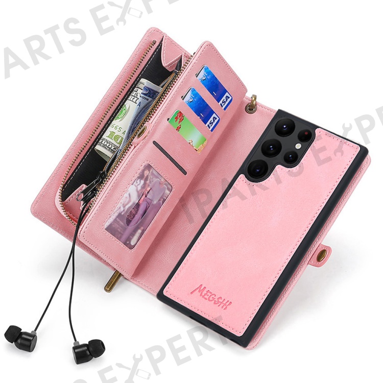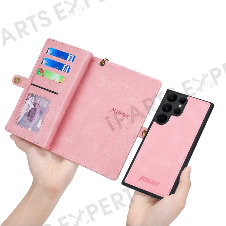 MEGSHI 017 Series Leather Case for Samsung Galaxy S23 Ultra Detachable Magnet Cover Zipper Wallet Shell with Wrist Strap - Rose Gold