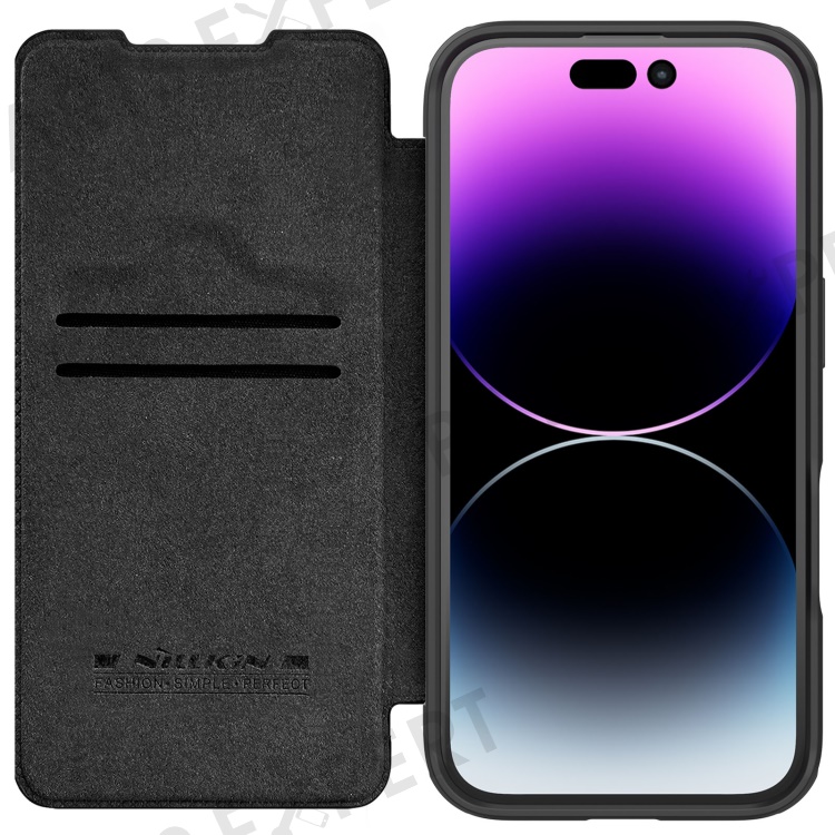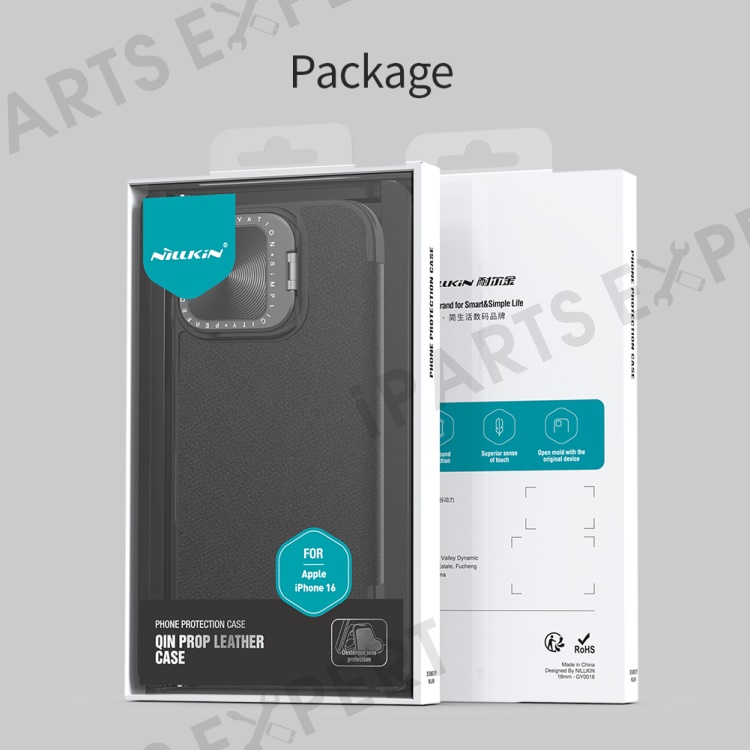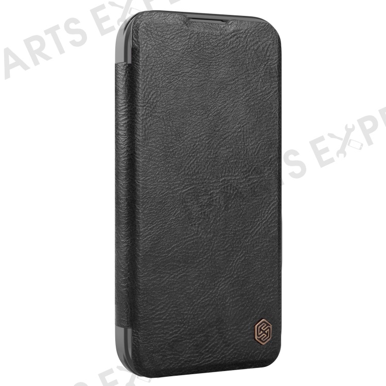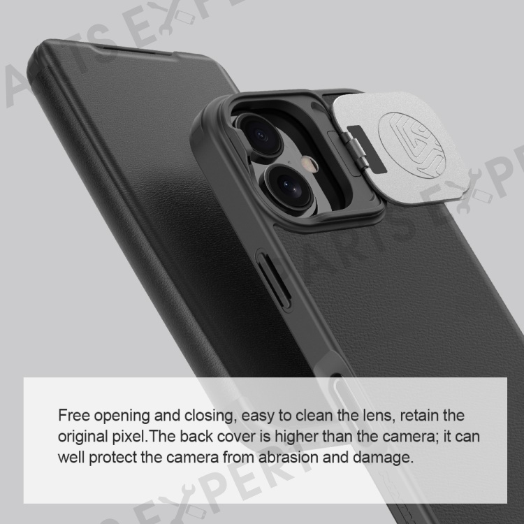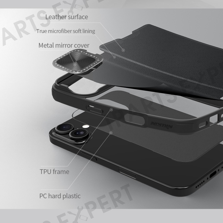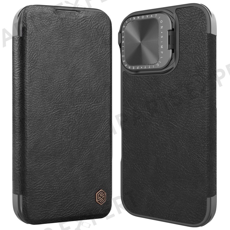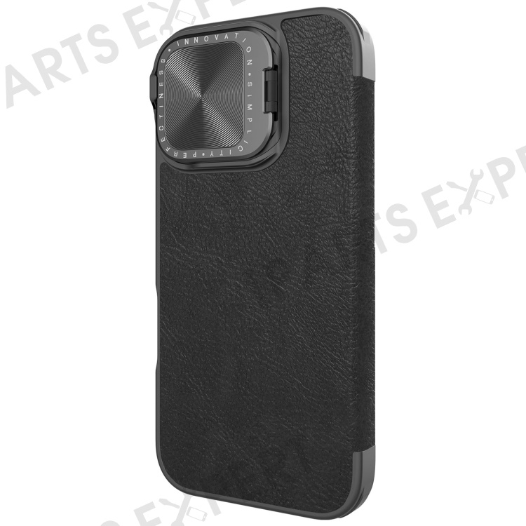 NILLKIN Qin Prop Series for iPhone 16 Leather Case Lens Kickstand Phone Cover - Black
