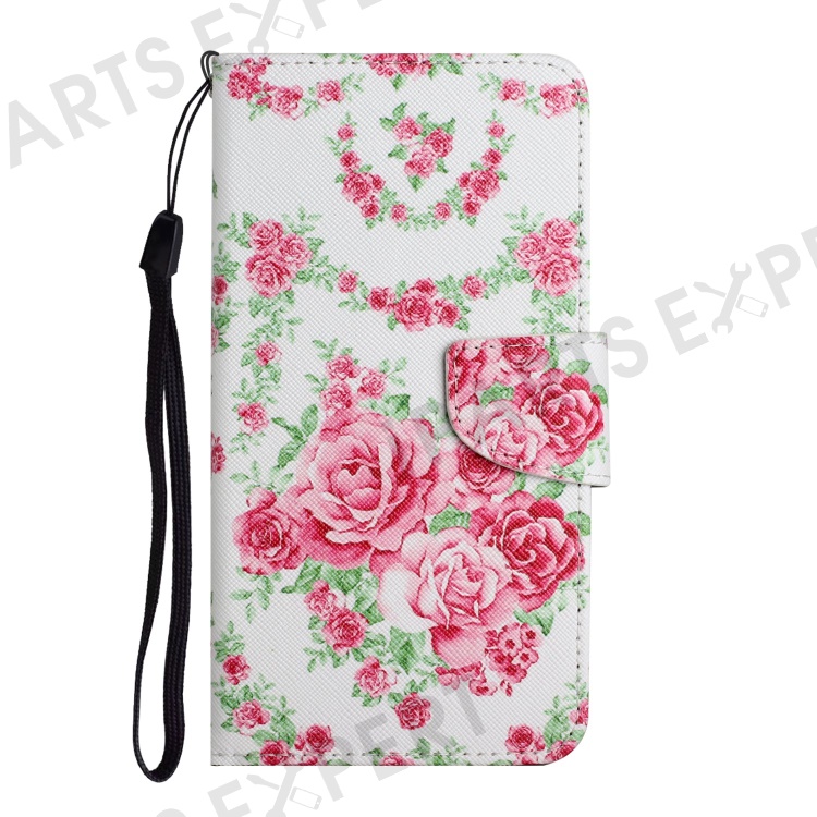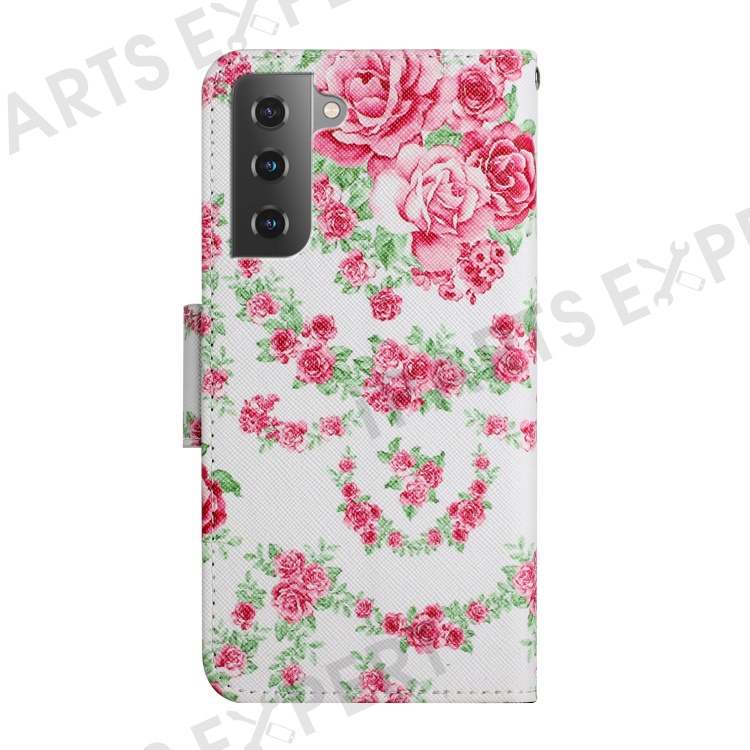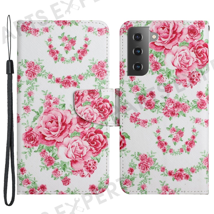 Pattern Printing All-round Protection Leather Phone Case Wallet Stand Cover Shell with Wrist Strap for Samsung Galaxy S22 5G - Rose Flower
