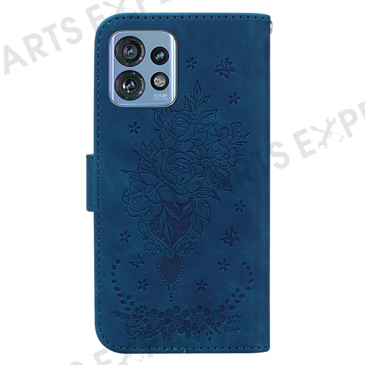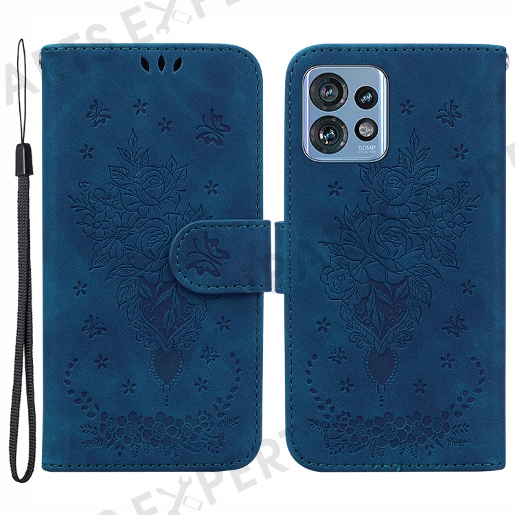 Phone Case for Motorola Edge 40 Pro 5G / Moto X40 5G / Edge+ (2023) , PU Leather Rose Butterfly Imprinted Stand Wallet Cover - Blue