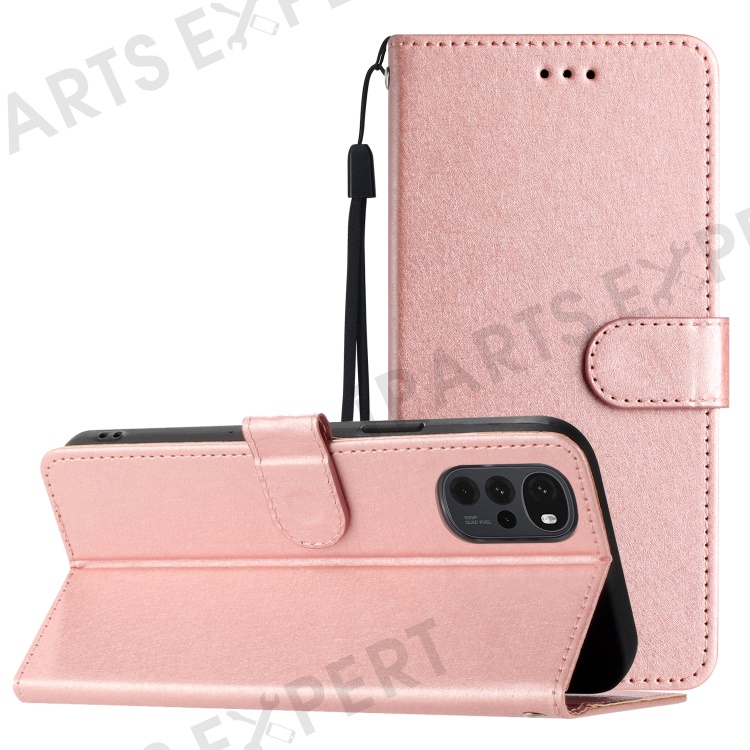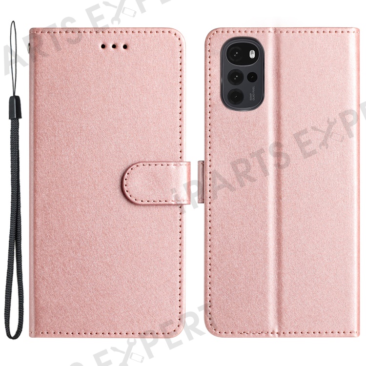 Phone Stand Cover for Motorola Moto G22 Silk Texture PU Leather Wallet Case with Hand Strap - Rose Gold