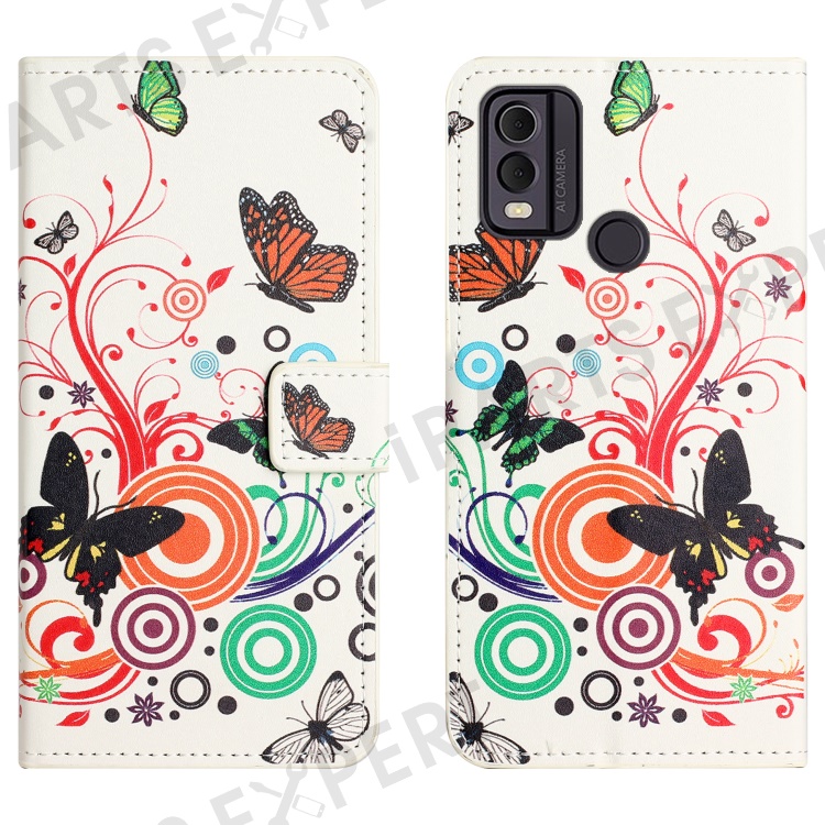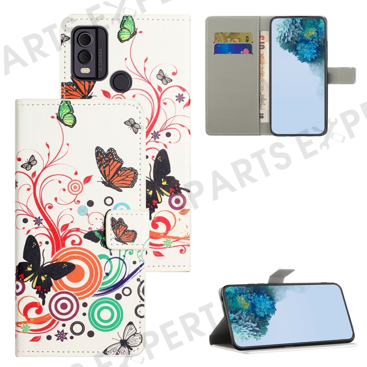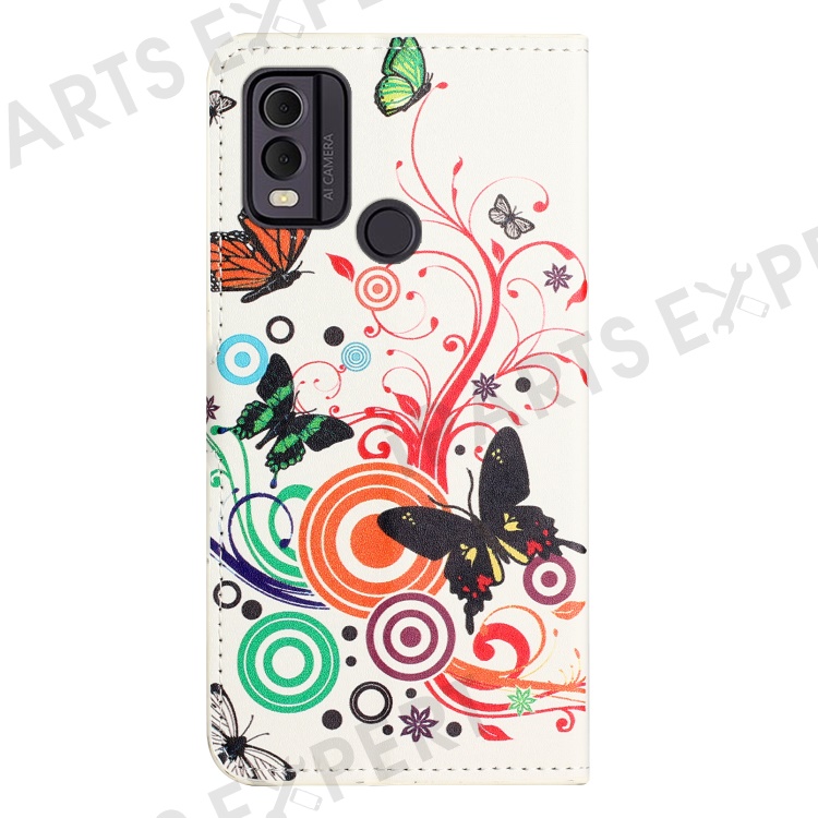 PU Leather Phone Case for Nokia C32 / C22 , Pattern Printing Wallet Stand Phone Cover - White / Butterflies