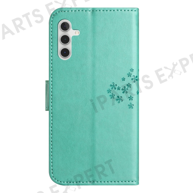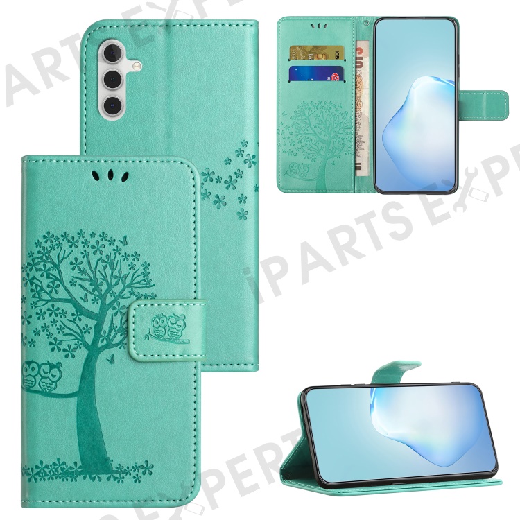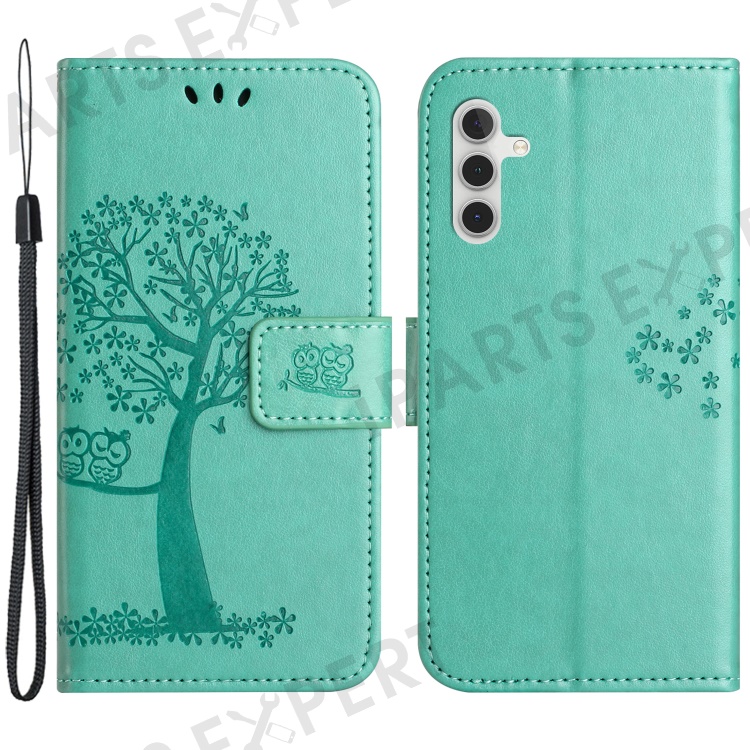 PU For Samsung Galaxy A25 5G (Global) (161.0 x 76.5 x 8.3mm) Owl Tree Imprinted Foldable Stand Phone Cover - Cyan