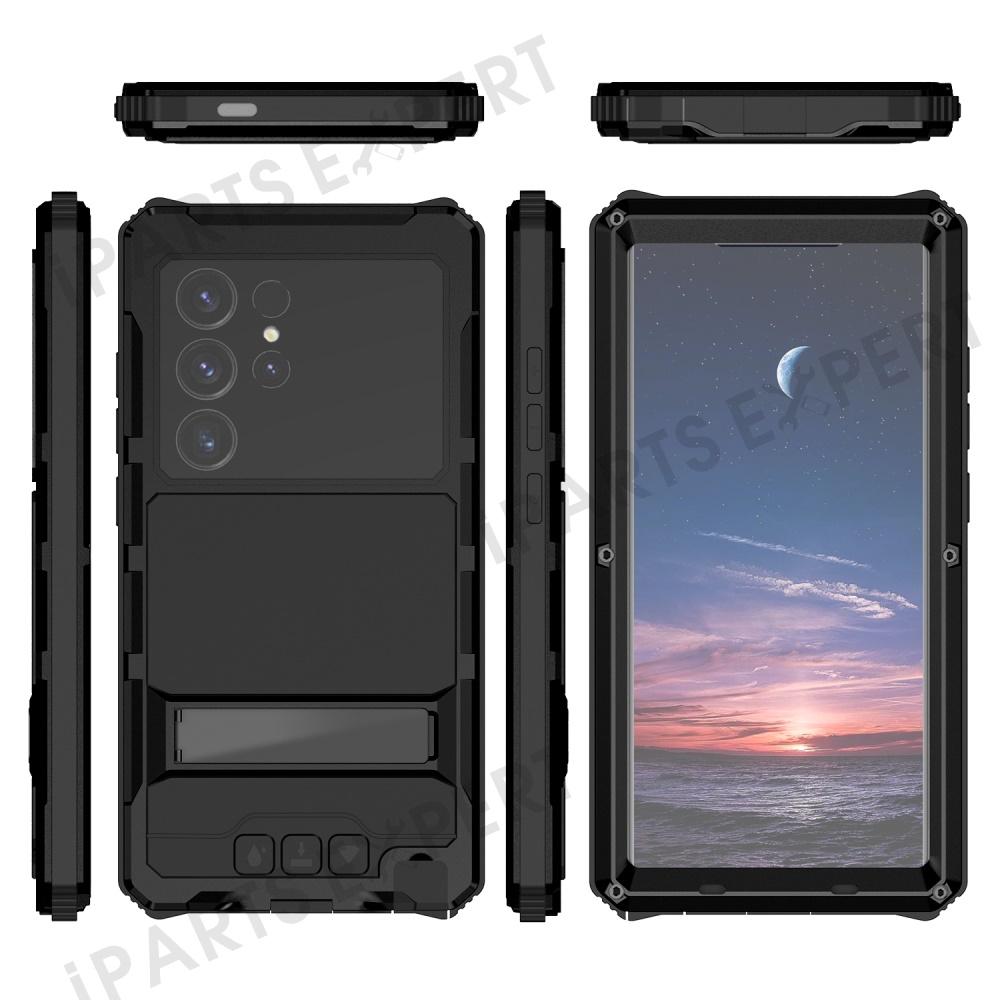R-JUST For Samsung Galaxy S25 Ultra Case PC + Silicone + Metal Kickstand Phone Cover with Tempered Glass Film - Black