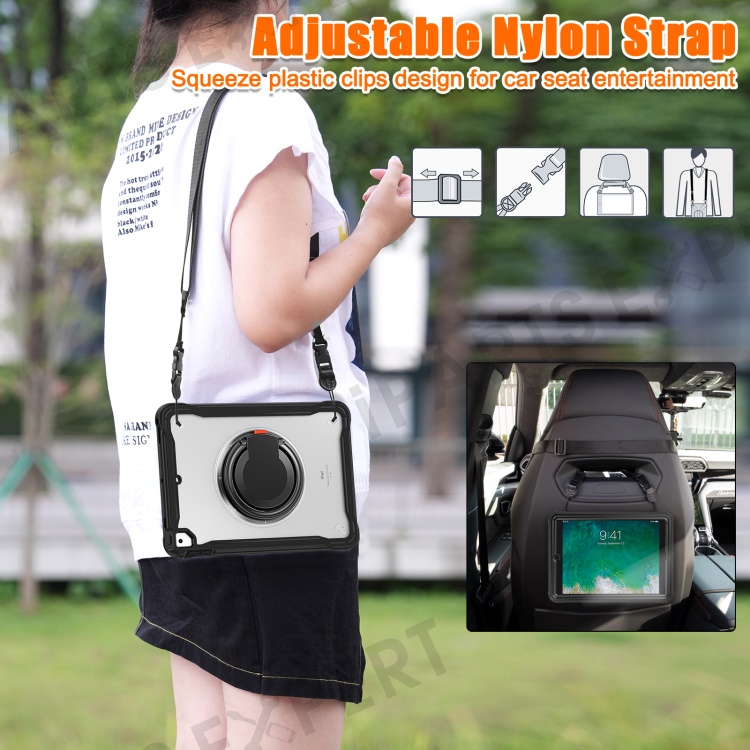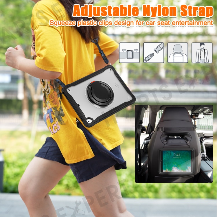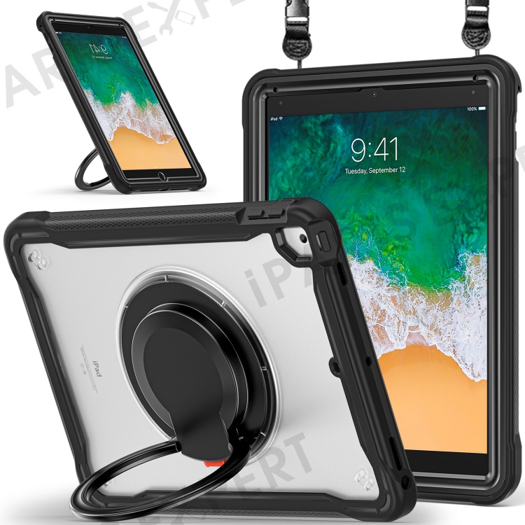 Rotating Kickstand Cover for iPad Air (2013) / Air 2 / iPad Pro 9.7 inch (2016) / iPad 9.7-inch (2017) / (2018) , PC+TPU Handle Grip Tablet Case with Shoulder Strap - Black