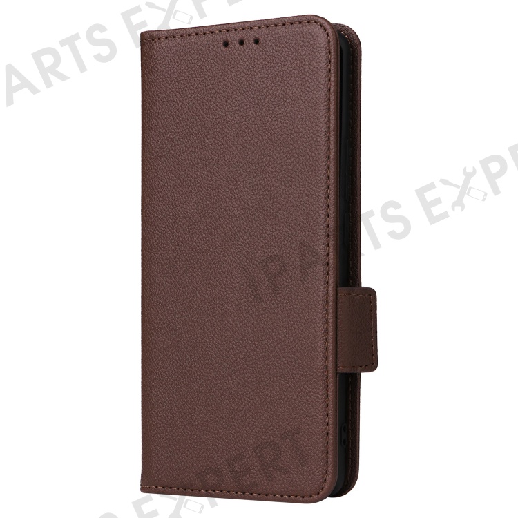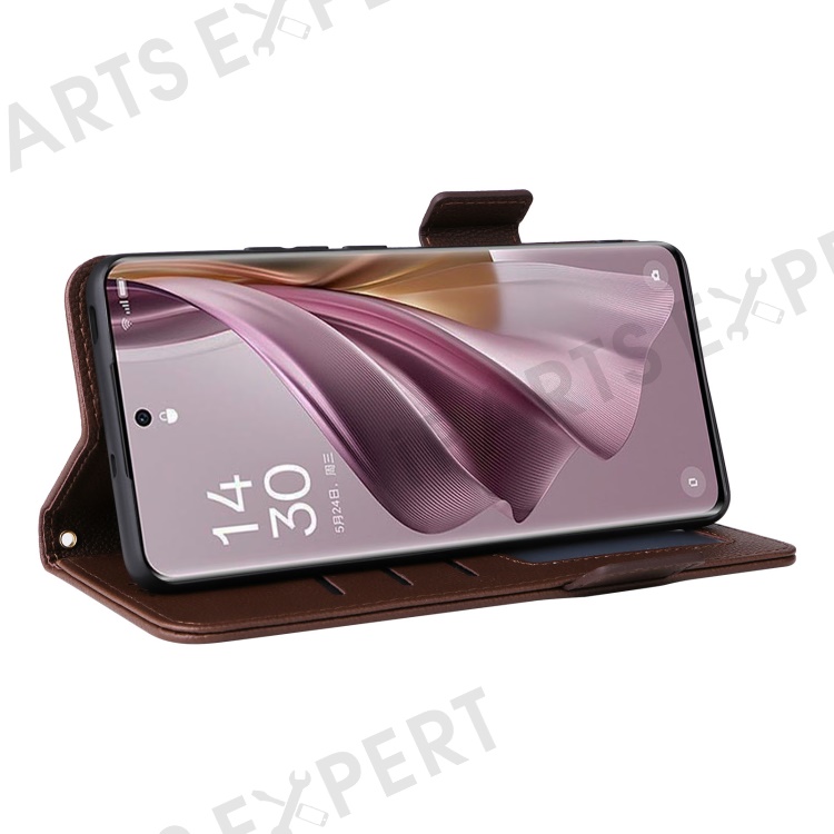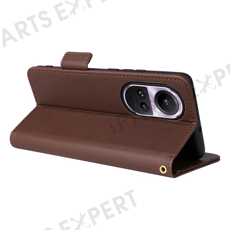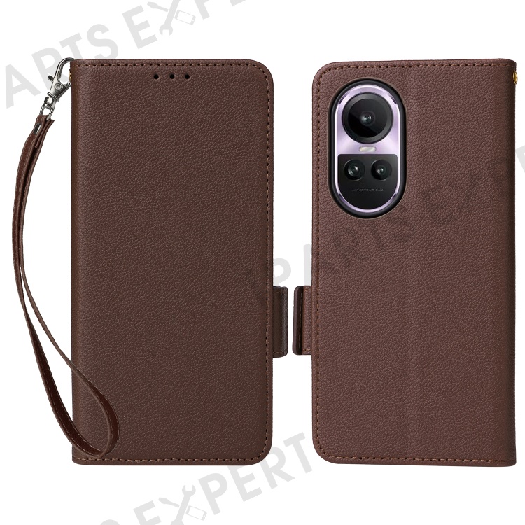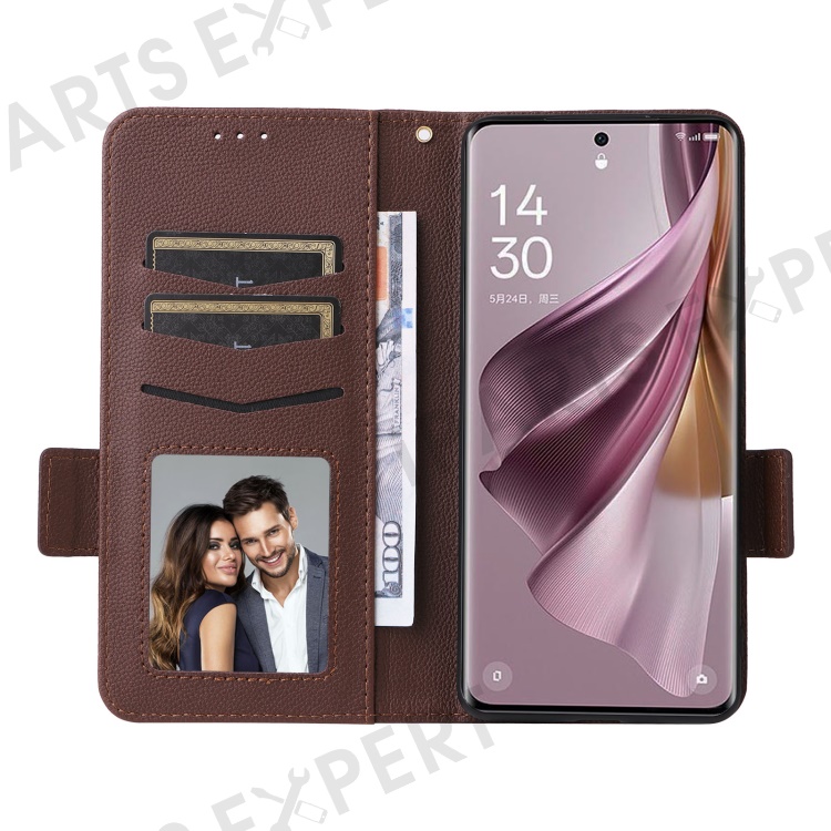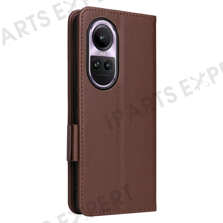 Shockproof Wallet Phone Case for Oppo Reno10 5G CPH2531 (Global) / Reno10 Pro 5G CPH2525 (Global) Litchi Texture PU Leather Flip Stand Cover with Strap - Brown
