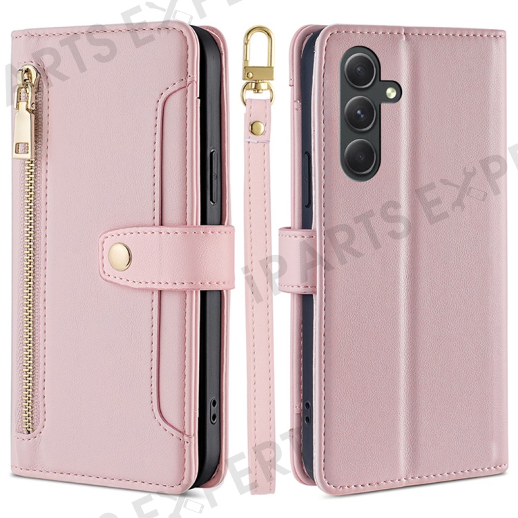 Stand Cover for Samsung Galaxy A54 5G Zipper Pocket Wallet Leather Phone Case with 2 Straps - Pink