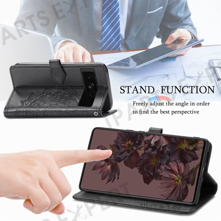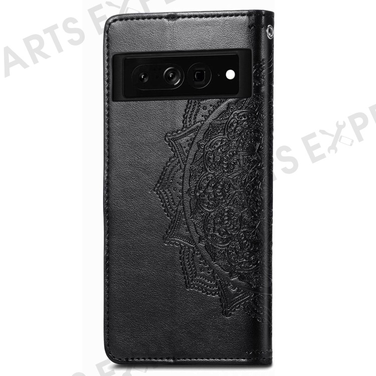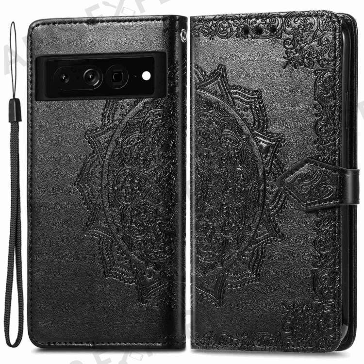 Stand Wallet Leather Case for Google Pixel 7 5G, Embossed Mandala Pattern Full Protection Inner TPU Phone Cover with Strap - Black