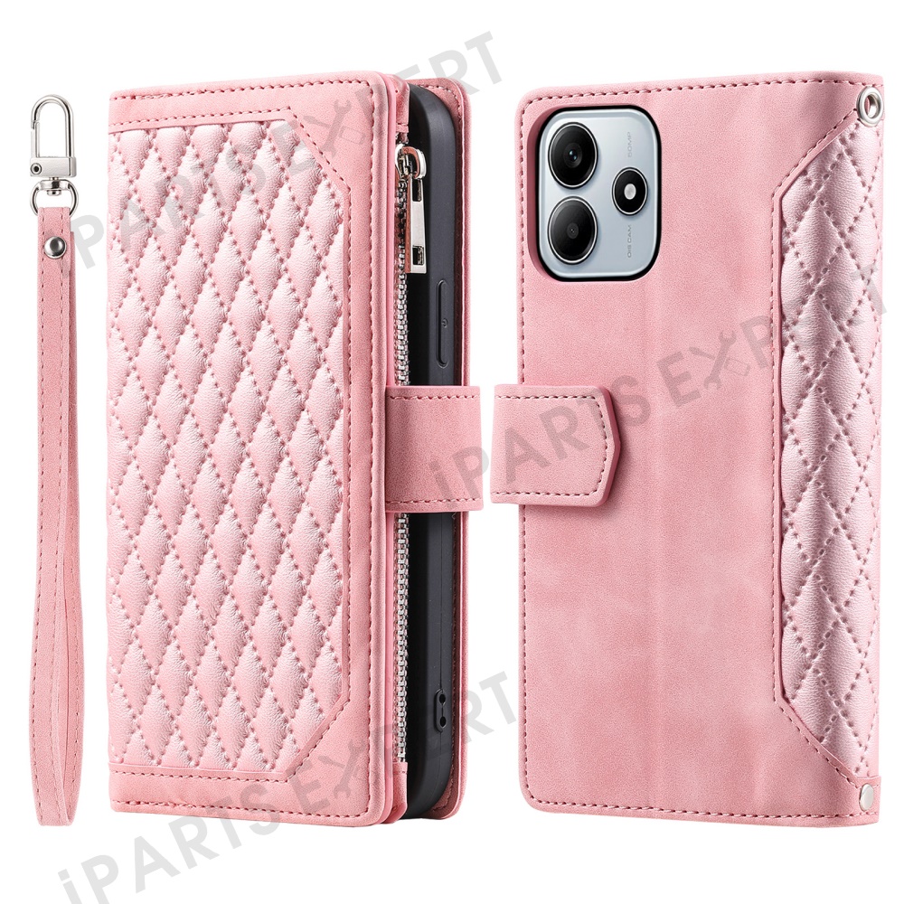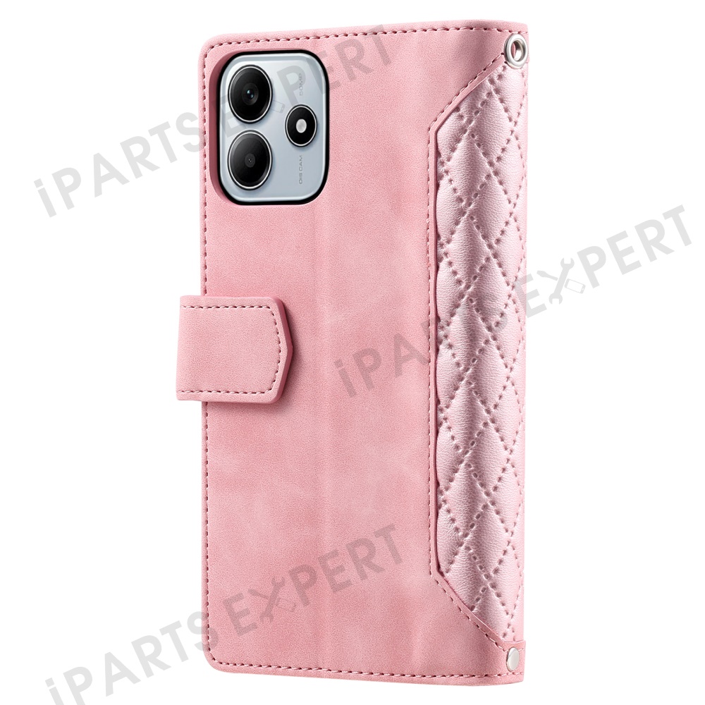 Style 005 For Xiaomi Redmi Note 14 5G Wallet Case Rhombus Stitching Line PU Leather Phone Cover - Rose Gold