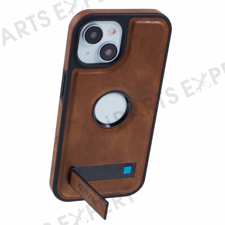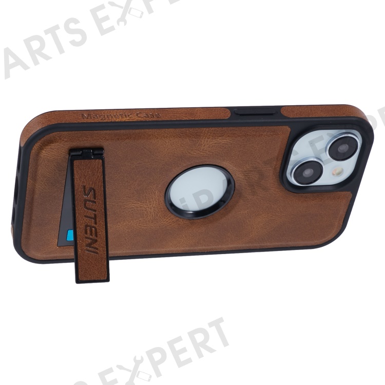 SUTENI G2 For iPhone 14 Magnetic Case Leather Phone Back Cover Waxy Texture Kickstand - Brown