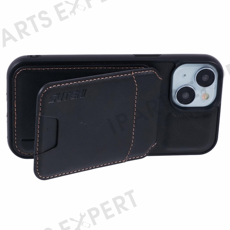 SUTENI H02 For iPhone 15 Case Waxy Texture Leather+TPU Card Slots Kickstand Phone Cover - Black
