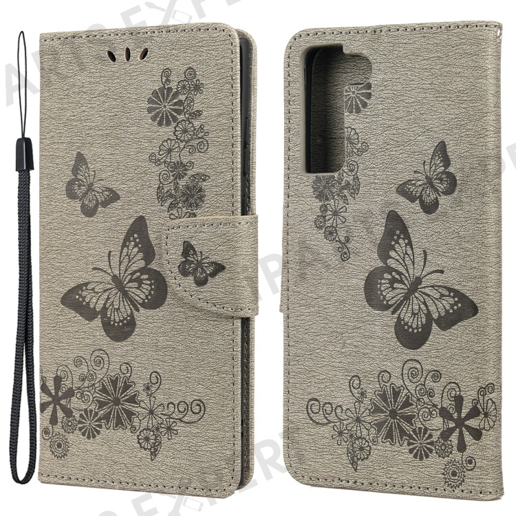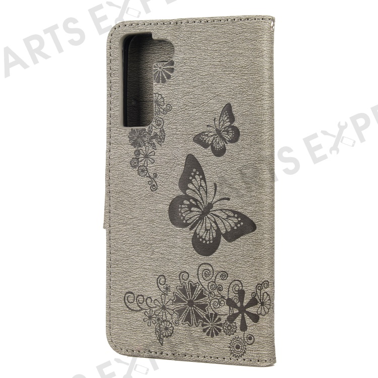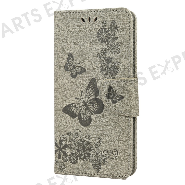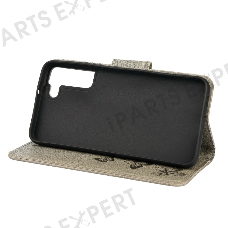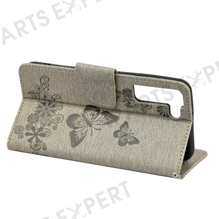 Wallet Stand Leather Cover Case with Imprinting Butterfly Flower for Samsung Galaxy S22+ 5G - Grey
