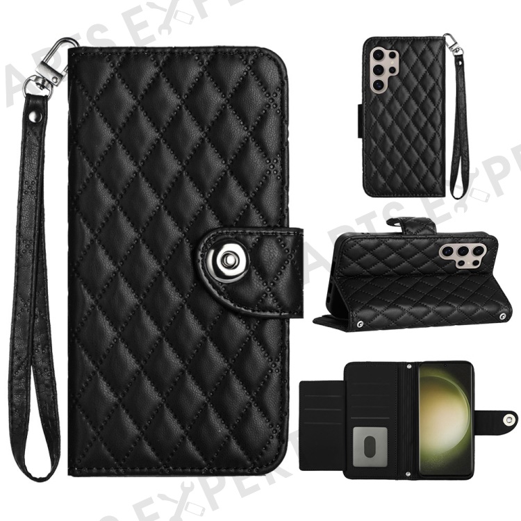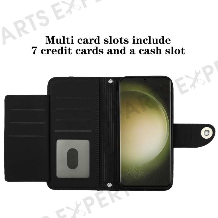 For Samsung Galaxy S24 Ultra Leather Case Phone Stand Cover with 7 Card Slots and Hand Strap - Black
