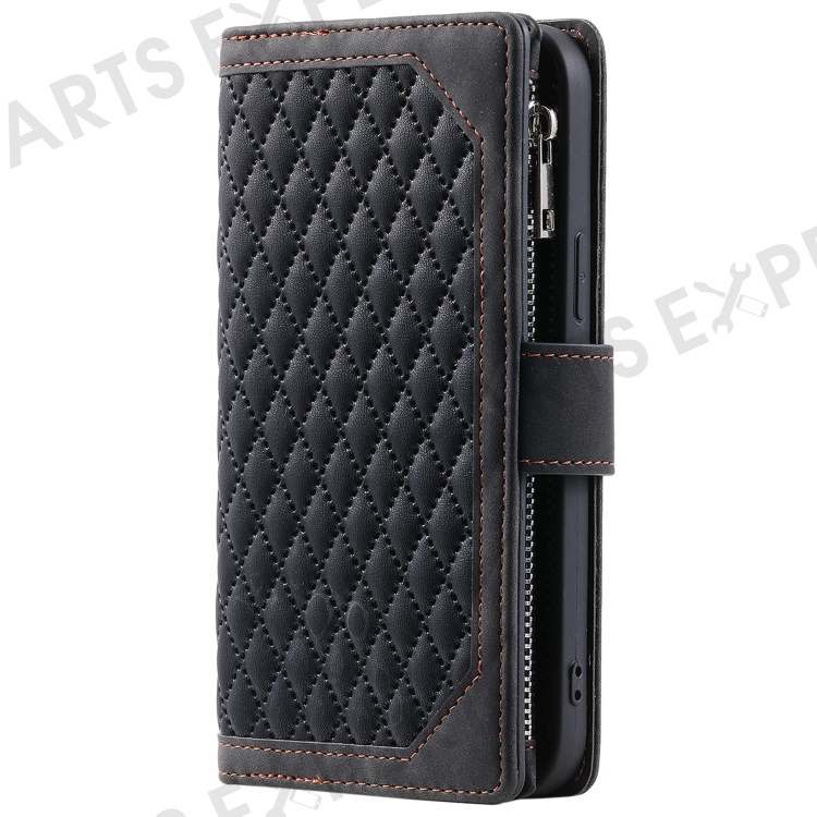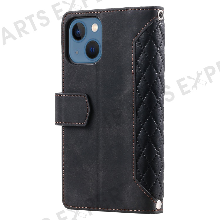 005 Style Rhombus Texture Stand Wallet Case for iPhone 14 6.1 inch, PU Leather Zipper Pocket Phone Shell with Wrist Strap - Black